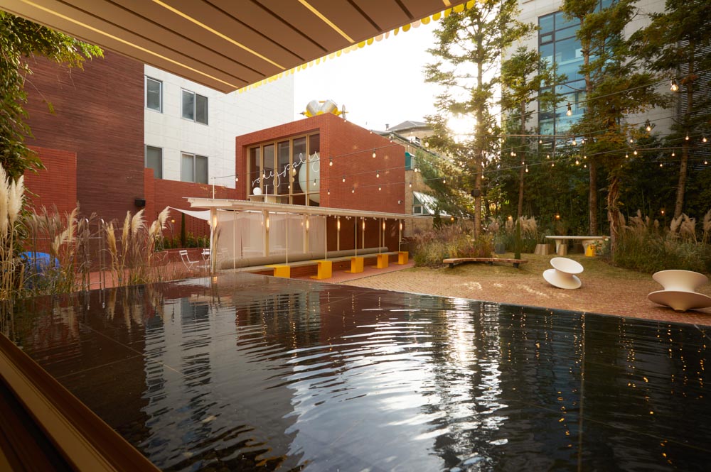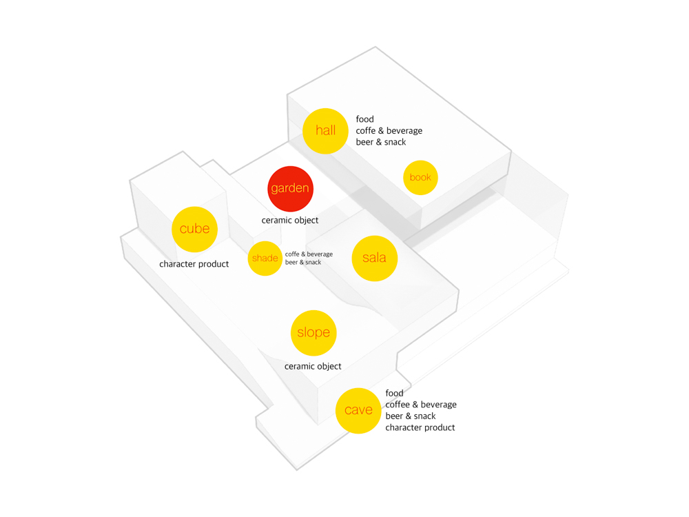 The key to the design is to combine the gardens hidden in two existing buildings into one, to secure the widest area in whole space, and to provide a medium. The scattered six spaces formed a relationship through this garden to perform each function. 7 spaces divided in the order of cave, cube, slope, shade, garden, hall, and sala, have different roles and heights, and provide various sequences.