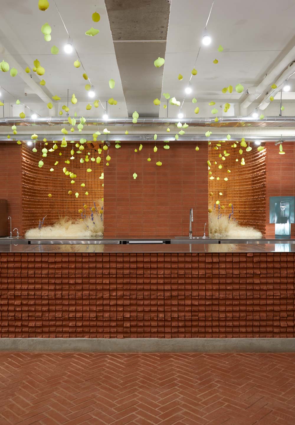 공간의 주된 재료는 붉은 벽돌이다. 붉은 벽돌은 보편성과 지속성을 내포하며 작은 셀들이 모여 견고하게 구축되는 소재다. 약 10만장으로 구축된 벽돌은 오랜 세월이 흘러도 쉽게 변하지 않는 소재의 보수적인 특성, 그리고 꾸준히 발전해 온 기업 정신과 맥을 같이한다. 벽돌의 다양한 구축방식과 패턴들은 보수성을 극복하는 퍼포먼스다. 내부에 사용된 소재는 주 소재인 벽돌에 어울리는 나무나 패브릭, 세라믹 등을 매칭하였다. 단 물성의 리듬감을 위해 스테인레스스틸을 사용하였으나 수작업으로 일일이 갈아내어 시간성이 느껴지도록 하였다.