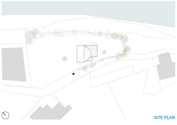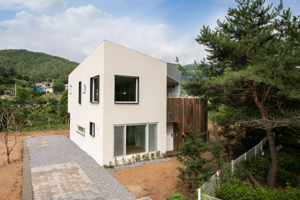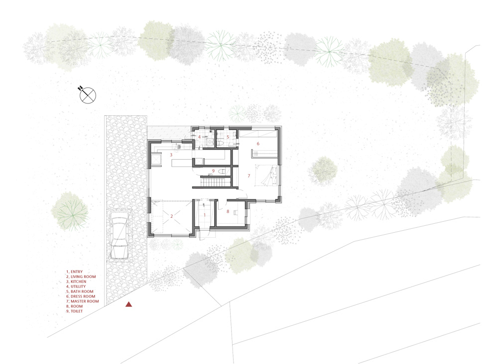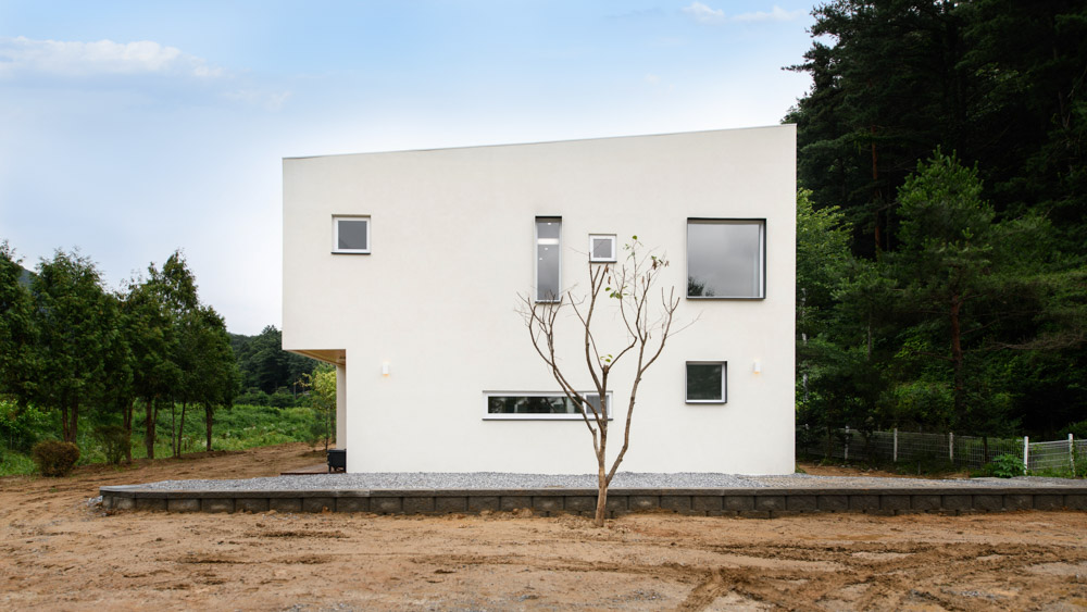 부지의 북쪽으로는 하천이 흐르고 있다. 이러한 이유로 법규상의 제약이 있었으며 남쪽으로는 청계산 기슭에 접해 있어서 남향 채광에서 다소 불리한 면을 가진 곳이다. 건축가는 이러한 환경적 제약을 해결하기 위해 동서축을 기준으로 차츰 작아지는 매스를 배치했다. 매스는 부지의 입구에서부터 현관을 지나 자연스럽게 비밀스러운 정원으로 이어진다. 집은 대지의 형태에 따라 늘어선 세 개의 직방형 매스가 각각 다른 크기로 조합되어 있는데, 땅과 집의 관계가 다양해지면서 내외부의 상호 보완적인 관계가 형성된다. 이 형태들을 하나로 묶는 왕관 형태의 지붕은 멀리 있는 산의 능선과 이어져서 주변 배경 속에 스며들게 만들며, 서로 다른 방향을 가지는 두 개의 테라스를 에워싸며 산과 정원, 하천의 풍경을 고스란히 받아들이는 공간으로 존재하도록 만든다.