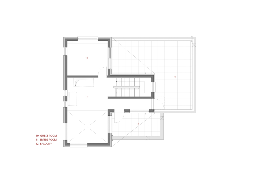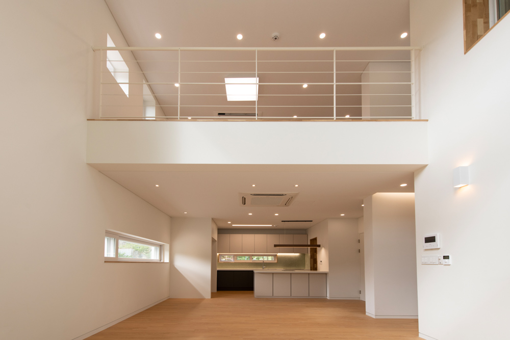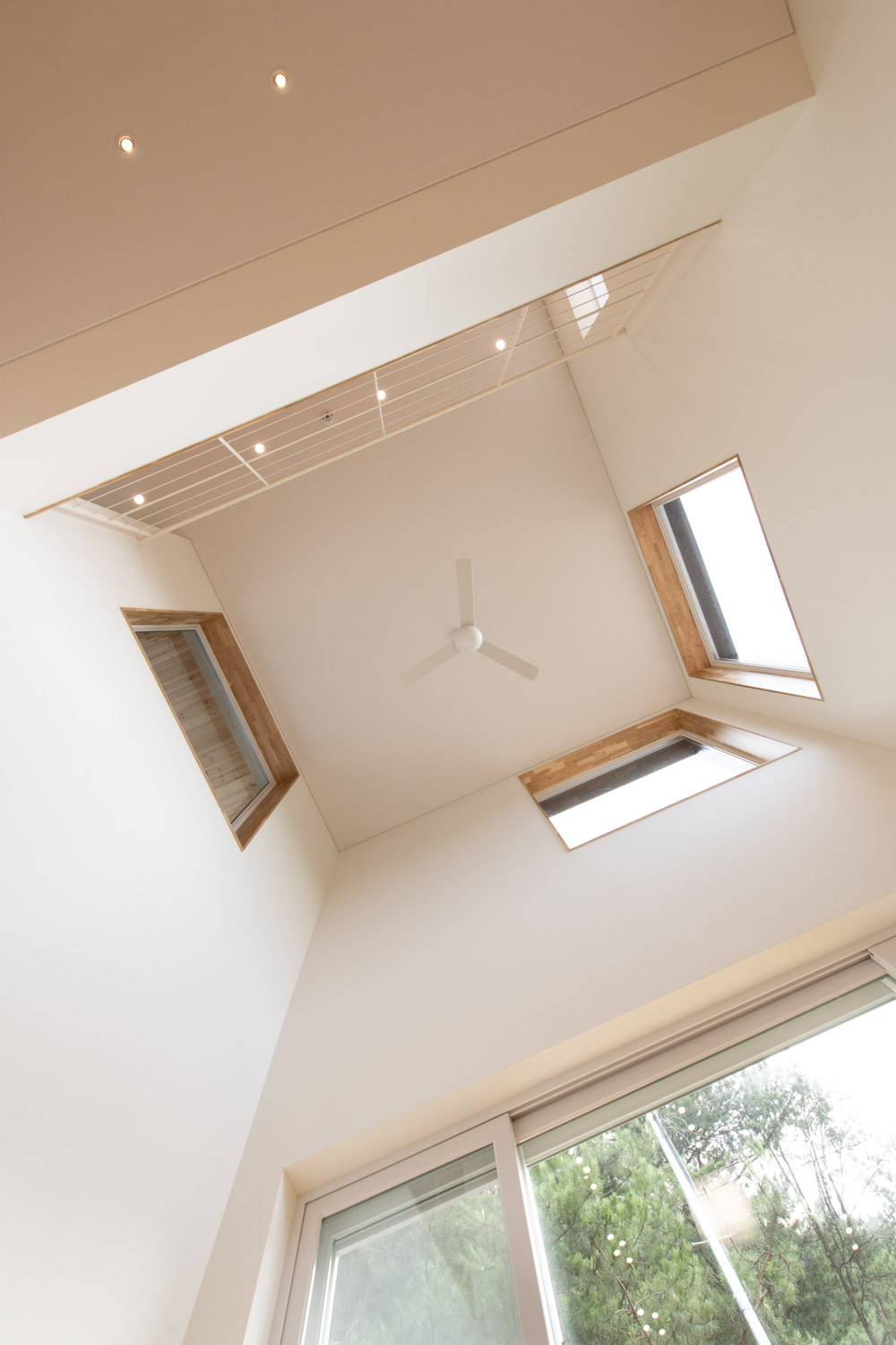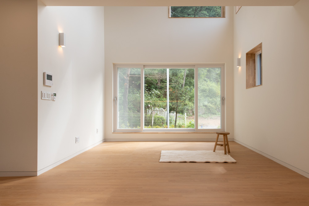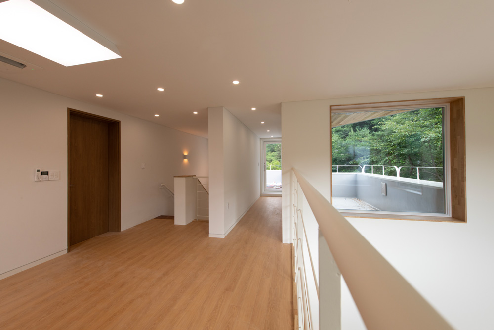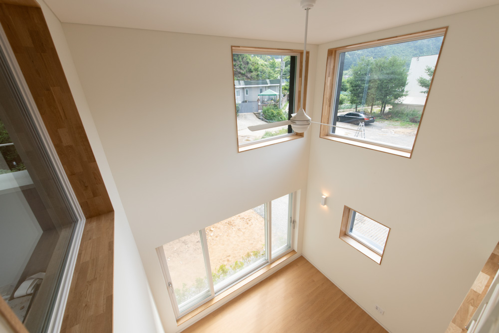 Furthermore, the living room surrounded by three sides of tall windows that profoundly embrace the hillside scenery is a space where the couple can relax while looking at the colorful lights and landscape, and this openness can extend to the kitchen. The interior staircase, which includes the bathroom, is the boundary that separates the master bedroom, living room, front door, kitchen and second-floor guest room, and the corridor on the second floor connects the two rooftop terraces each provided on the east and south sides, allowing the free circulation between the exterior and interior.