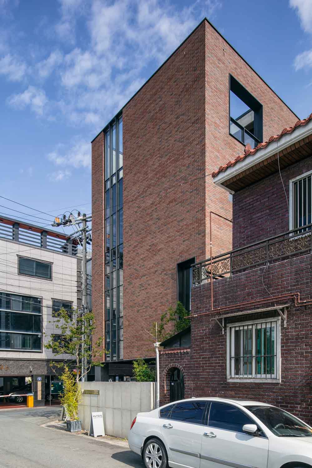 물론 이는 1층에 요구되는 주차공간에 대한 대응이기도 하다. 주 정면이라고 할 수 있는 북측 입면은 남측과 달리 외부 휴식공간을 통해 매스를 2개로 분절하고, 분절한 매스의 입면을 다시 서측 입면의 개구부 등을 통해 판으로 해체하는 식으로 무거움을 덜어내고, 가벼운 막의 성격을 띠게 된다. 서측은 프라이버시로부터 자유롭다는 맥락을 직관적으로 드러내며 덩어리와 막 사이에 어색하지 않은 경계선을 구성한다. 또한, 잘 마무리한 조적 벽체의 마감은 주변의 맥락을 받아들이면서도, 깊이의 격차를 현시한다. 차이와 유사점들이 무리 없이 연결되는 것은 재료 덕이기도 하지만 입면에 적용된 태도에 기인한 바가 크다.