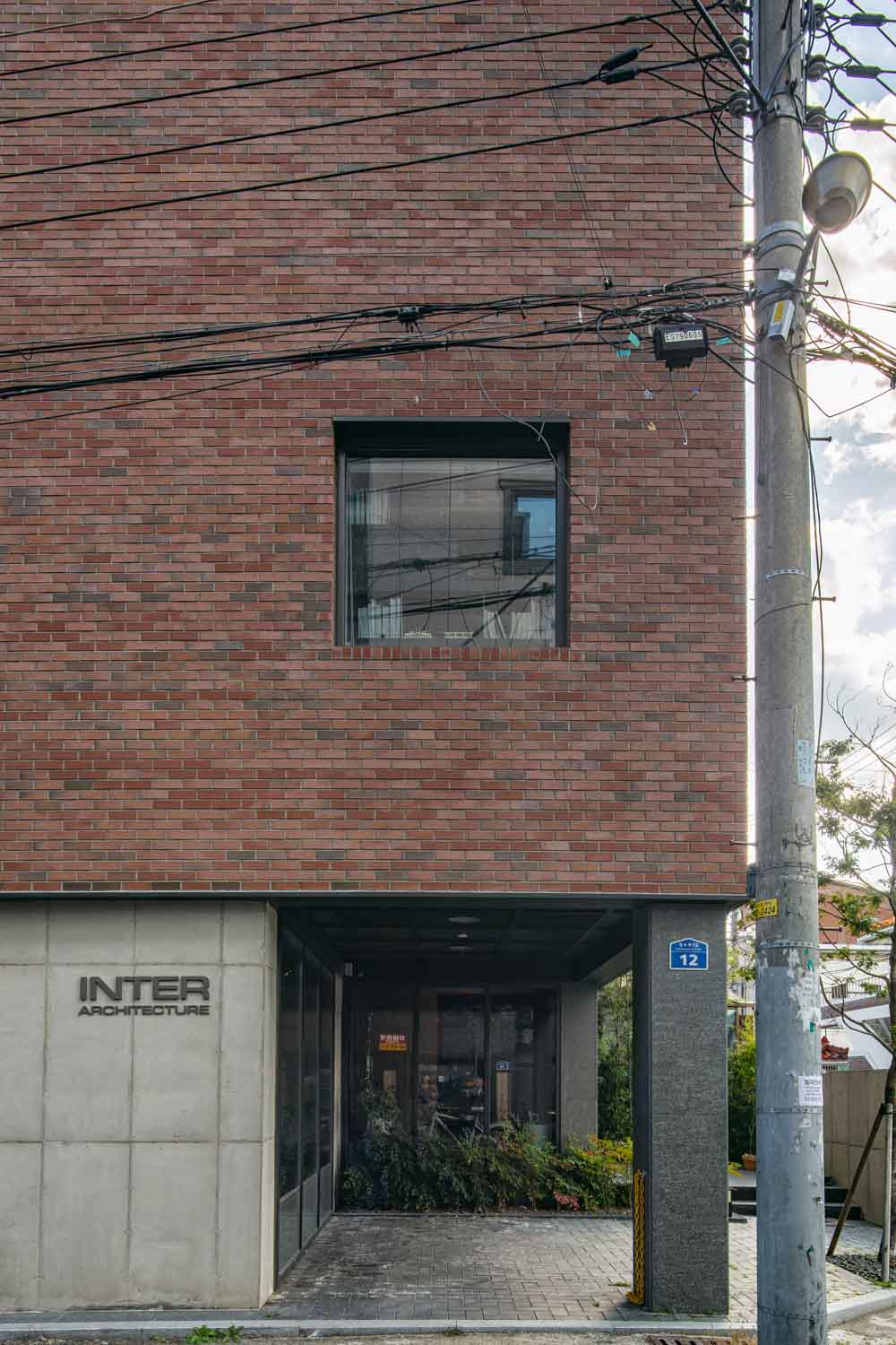 이 작업에서 부지의 물리적 접근성이 일반적인 업무시설에 견주어 떨어짐을 단순히 건축가에게 주어진 극복 대상으로만 볼 수는 없다. 결국은 건축가이자 건축주의 선택이었기 때문이다. 건축가는 비용과 편익의 문제에서 영리하게 “대로변이 아니어도 되는 이유”를 영리하게 발견했다. 부지와 연결된 대로변에는, 입점만 하면 부동산 가치가 상승한다는 프렌차이즈 카페가 있다. 대로변에서 건물 부지 사이에는, 시야를 막는 높은 건물이 없어 카페나 도로에서 사옥의 남측과 서측 입면이 고스란히 드러난다. 물리적 접근성의 한계를 심리적, 시각적 접근성으로 보완한 셈이다.
