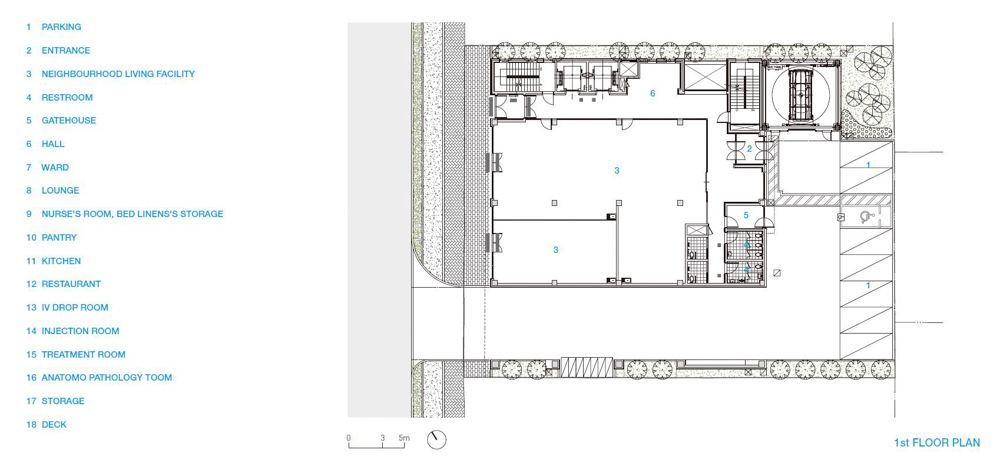 The 3rd and 4th floor is wards. The entry to the hospital rooms inside has blocked firstly from the elevator and staircase, and as I explained before it’s a plan where wards have arranged on the outside making courtyard space as a center. The 5th floor is composed of the attached facilities of hospitals: Administration and office space, kitchen, cafeteria etc. Giving us composure by connecting with the outside deck.