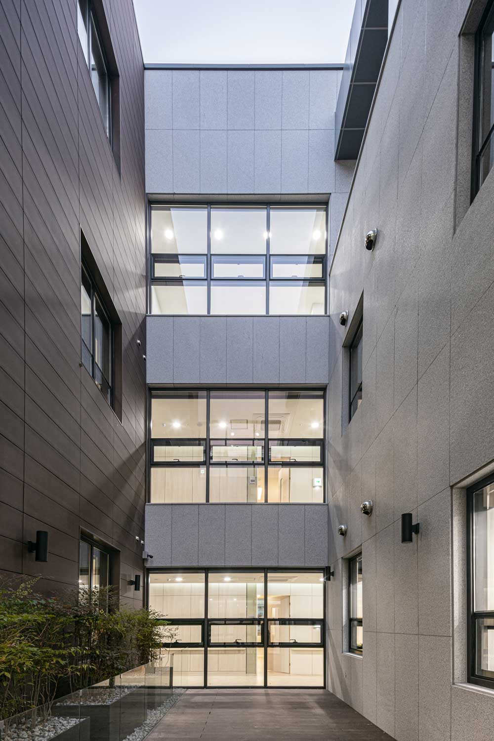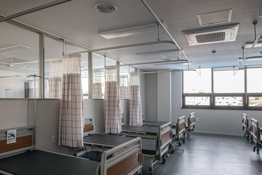 The structure which fronts the air outside was required due to the needed hospital room spaces in terms of the entire scale space composition and the restrictions per levels etc. in addition to it, we needed a structure giving us openness inside by making a hole in the middle of thick square void as a courtyard. This kind of space layout simultaneously secures openness in ward floor level and making a flow space which circulates naturally.