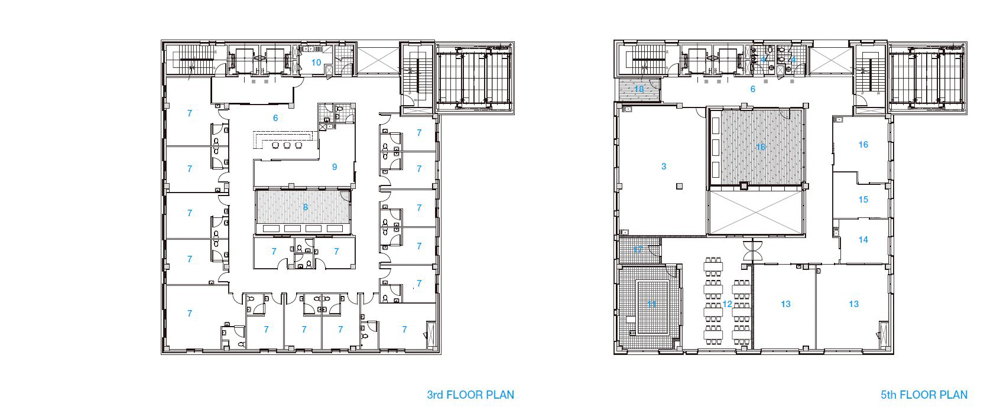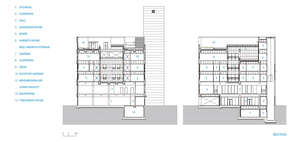 The 3rd and 4th floor is wards. The entry to the hospital rooms inside has blocked firstly from the elevator and staircase, and as I explained before it’s a plan where wards have arranged on the outside making courtyard space as a center. The 5th floor is composed of the attached facilities of hospitals: Administration and office space, kitchen, cafeteria etc. Giving us composure by connecting with the outside deck.