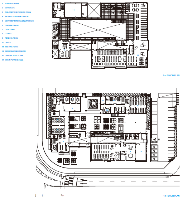 The book platform is the main space of the library that connects the reading room area and the cultural education area and is the main communication space within the library where the resting lounge that connects to the exterior space and the exhibition area, as well as the browsing world, reading stairs, etc. are connected.