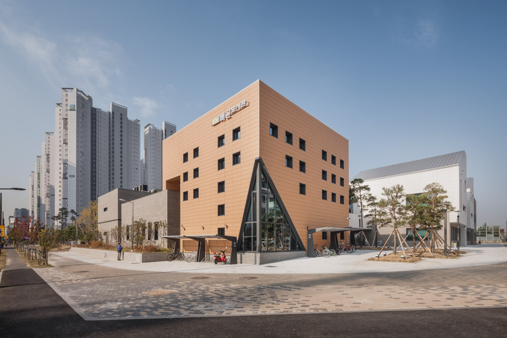 The most important issue that was faced when designing Baegot library was the land being large compared to the scale of its. Architecture is not free from the floor area ratio. Individual floor area ratio are fiercely taking place throughout the newly formed Baegot new city as well. In that event, what kind of appearance should a library being built in this land have? Would it be right to design a library with a stylish form, a fun and dynamic interior space and a wide yard for citizens to share in front of the library, just like the appearance of a library that immediately came to mind, as if it were being designed in Seoul or other cities in the metropolitan area? The design started with asking such questions to ourselves.