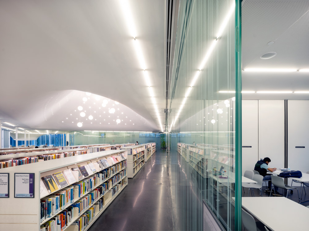The project site was physically constrained, framed by a commercial plaza to the east, a main road to the south, and a natural ravine to the north and west. The architects positioned the library as close to the street as possible, in order to solidify the building’s presence with the street, preserve the site’s natural topography and irrigation patterns, and channel interior views towards the ravine. This siting also maximized room in the rear for a neighbourood park, and a parking and drop-off sequence with a canopied entry forecourt. The building is connected a landscape: from the organically shaped perimeter; and the creation of an undulating topography between the fluidly shaped ceiling and mountainous green roof; and the sloping floor slab of the interior and the flat landscape of the park. The park is comprised of a series of terraced contemplative gardens for older users as well as a splashpad and childrens’ play area organized around the word “Imagine.”
