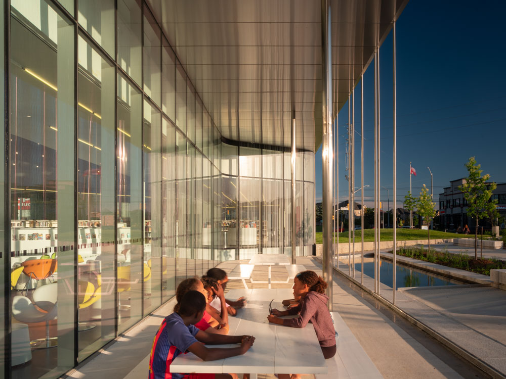 A solar-responsive ceramic frit pattern on the building’s windows is striated patterns range from white to dark gray expanding and contracting based on solar orientations, while also visually merging with a series of stainless steel rods that add an additional layer of solar resistance while supporting the glazed units and forming the courtyard enclosures. These elements are conceived as a functional abstraction of two combined metaphors: the turning pages of a library book and the trunks of trees in a forest. Expressing inclusivity, innovation, dedication to learning, collaboration, curiosity, courage and accountability the new building reflects the vision of the institution. The new Springdale branch provides Brampton Library with an emboldened presence and a valuable resource to the Springdale community.