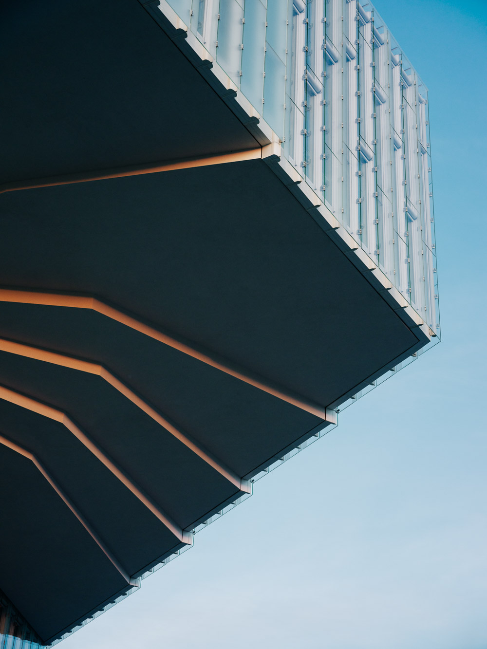 The site is relatively small. In order to avoid building too many floors, the building cantilevers out above its footprint: The first floor above the street to the east, and the fourth floor almost 20m out above the urban plaza, creating a protective covering for the entrance. This largest cantilever displays the building to the city and still preserves the line of sight to the neighbouring Opera. The cantilevered floors are suspended from the roof above. The roof has a characteristic folded geometry that provides structural strength.