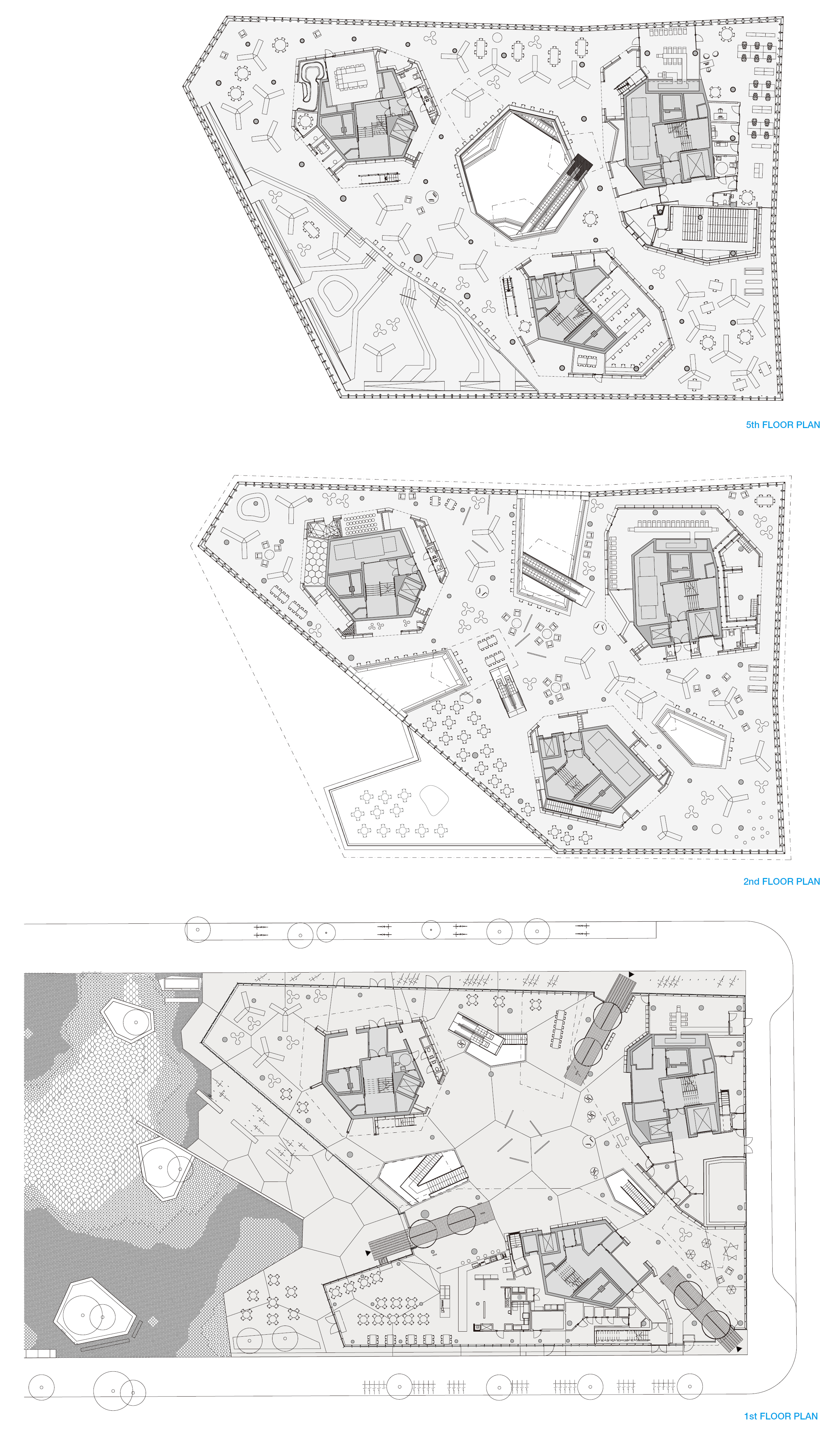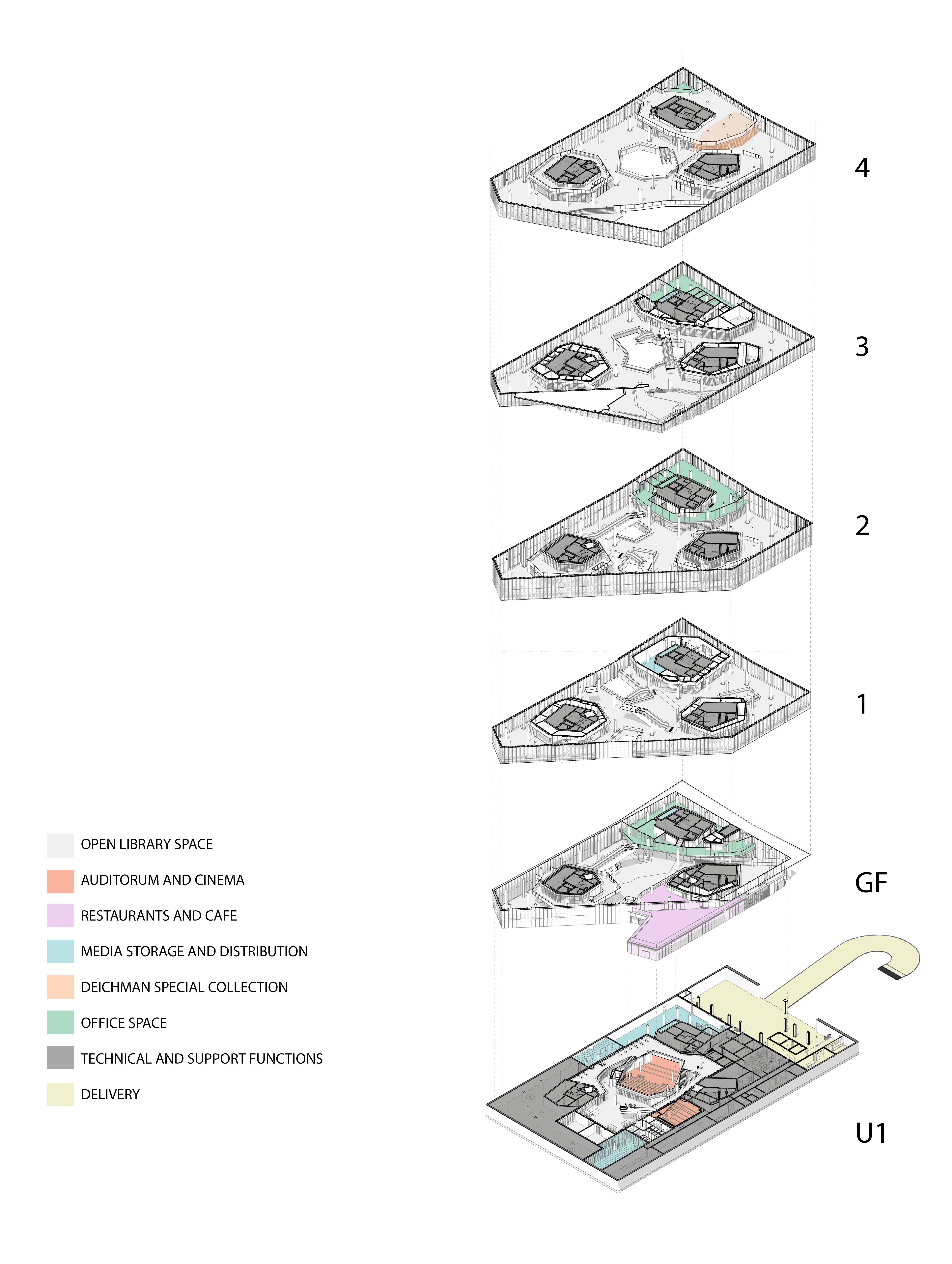 In order to create an enhanced feeling of openness and connection with the city, the ground floor facade is completely transparent. Visitors are received by three equivalent entrances, facing in different directions. Three ‘light shafts’ cut diagonally through the building from each of the entrances, giving a glimpse into different sections of the library. The light shafts connect the floors and distribute daylight downwards from three big skylights in the roof. An open public space dominates the interior, with a variety of furniture and activities. Enclosed spaces and niches are organised around three free standing book towers, liberating the facades and allowing daylight to flow in from all directions. Rooms and niches create arenas for temporal installations and exhibitions, with a rich variety of colours and atmospheres. The open areas have more permanent surfaces in neutral colours and robust materials.