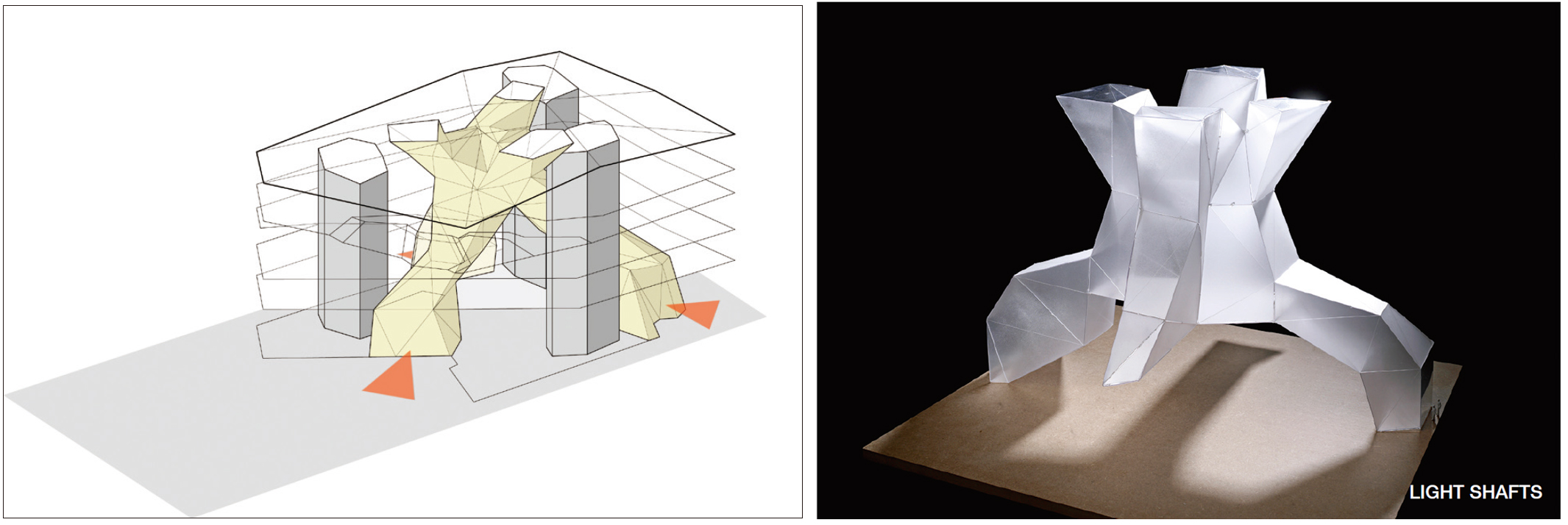 The site is relatively small. In order to avoid building too many floors, the building cantilevers out above its footprint: The first floor above the street to the east, and the fourth floor almost 20m out above the urban plaza, creating a protective covering for the entrance. This largest cantilever displays the building to the city and still preserves the line of sight to the neighbouring Opera. The cantilevered floors are suspended from the roof above. The roof has a characteristic folded geometry that provides structural strength.