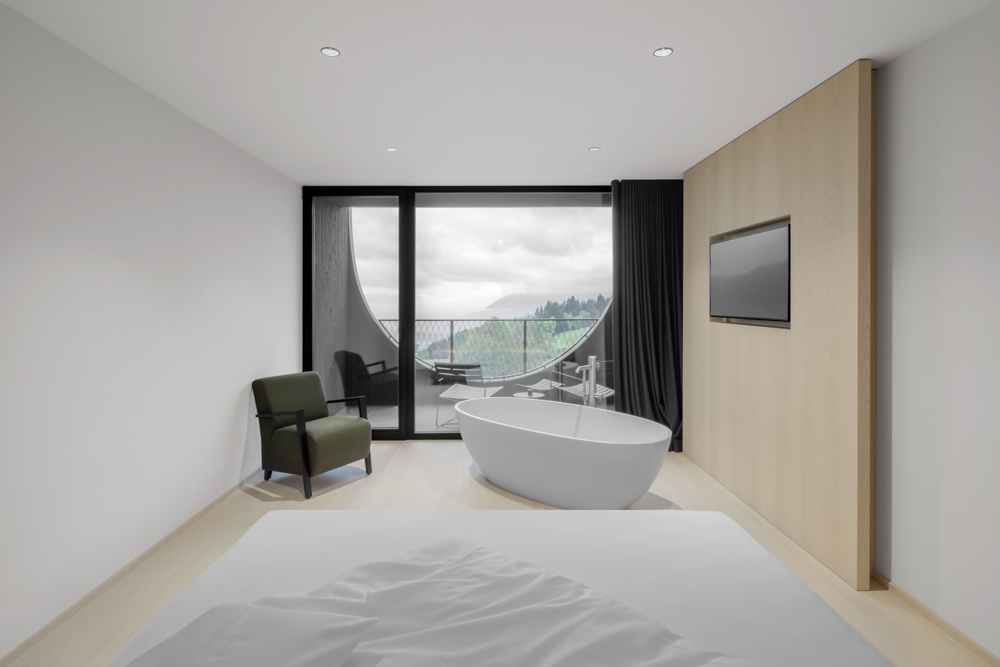 The hotel is located in Maranza, in the Italian region of South Tyrol. Meadows and fields surround the well-shaped mountain of the small Alpine village, just above Puster Valley, a tourist destination well known for its marvelous hiking routes. The project location is characterized by its unique scenery and impressive panoramic views of the Dolomites Mountains. The new hotel structure is fragmented into four shifted volumes to break down the scale of the entire structure while at the same time respecting the scale of the surrounding buildings.
