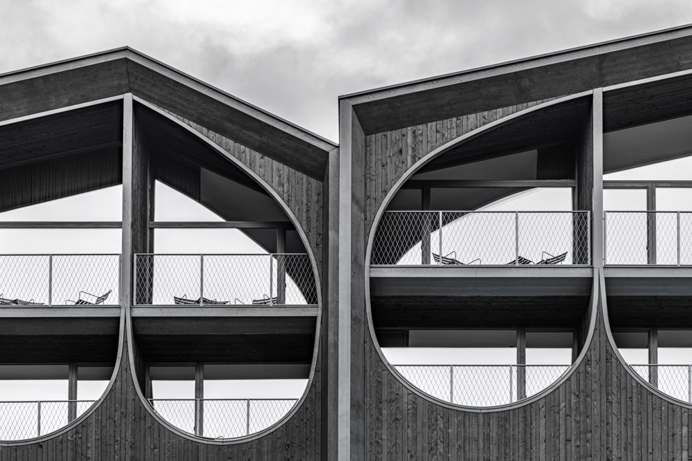 The composition is inspired by the vernacular architecture of the region and the classic wooden barn reinventing a contemporary reinterpretation of this typology. The curved shape of the exoskeleton façade is inspired by the pitchfork used by local farmers. Maranza is a small village in South Tyrol with a significate agricultural background. The interiors are simple and functional, a timeless Alpine style. Ash wood is combined with typical green loden textiles, adding a dash of color giving continuity to the natural palette of the surrounding landscape. Wood is the main protagonist of the project, both outside and inside, creating contrast with the exterior blackened wood and the interior lightwood.