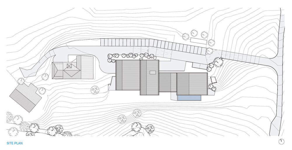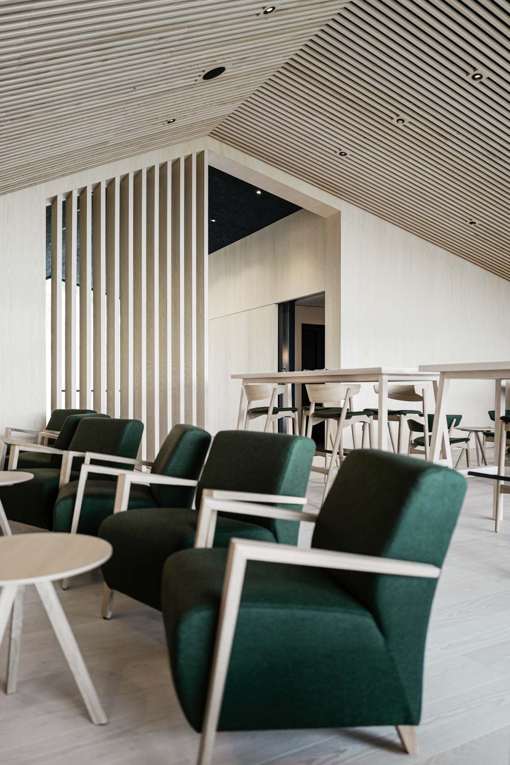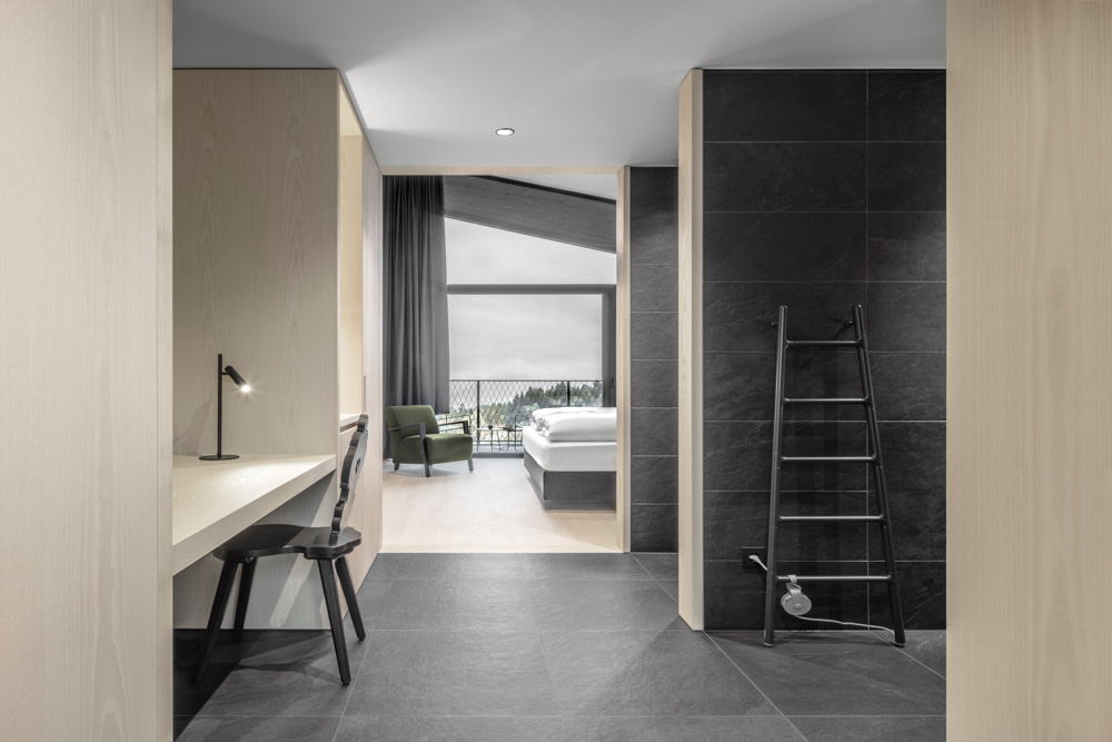 The composition is inspired by the vernacular architecture of the region and the classic wooden barn reinventing a contemporary reinterpretation of this typology. The curved shape of the exoskeleton façade is inspired by the pitchfork used by local farmers. Maranza is a small village in South Tyrol with a significate agricultural background. The interiors are simple and functional, a timeless Alpine style. Ash wood is combined with typical green loden textiles, adding a dash of color giving continuity to the natural palette of the surrounding landscape. Wood is the main protagonist of the project, both outside and inside, creating contrast with the exterior blackened wood and the interior lightwood.