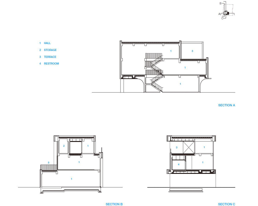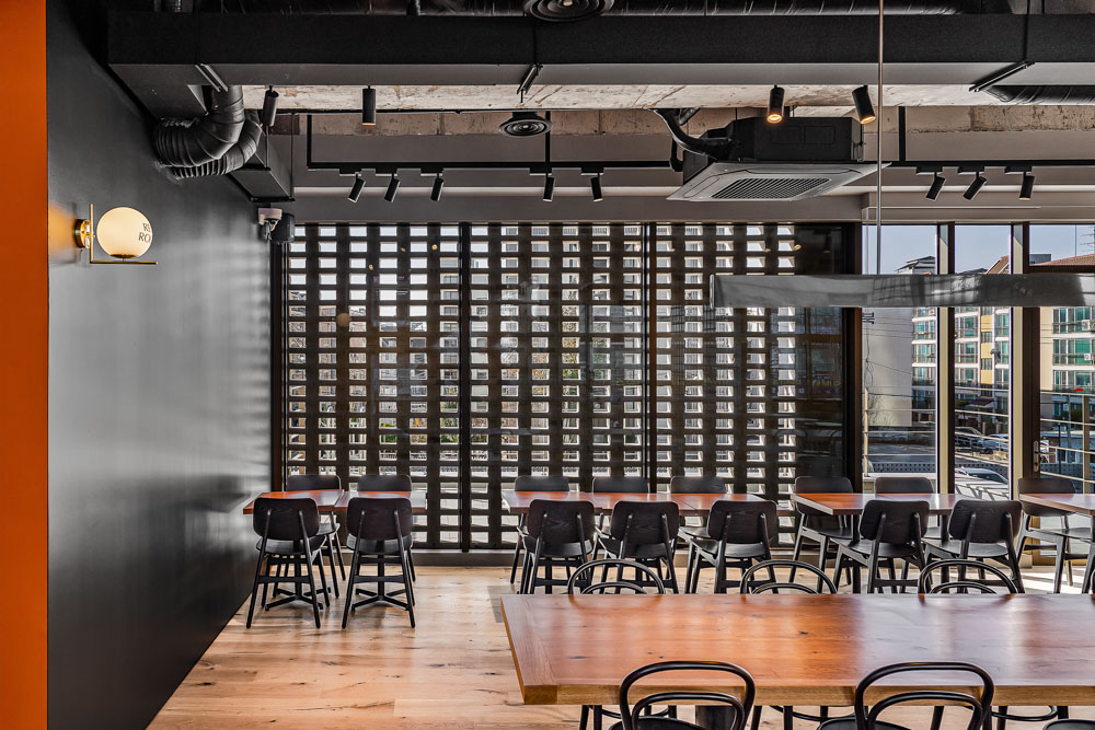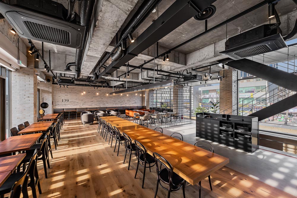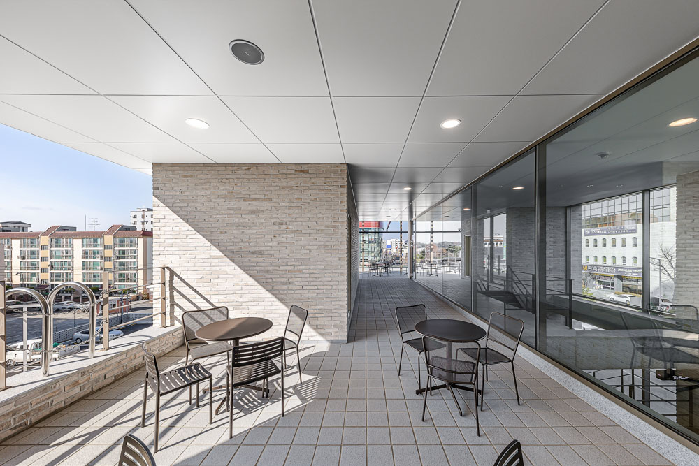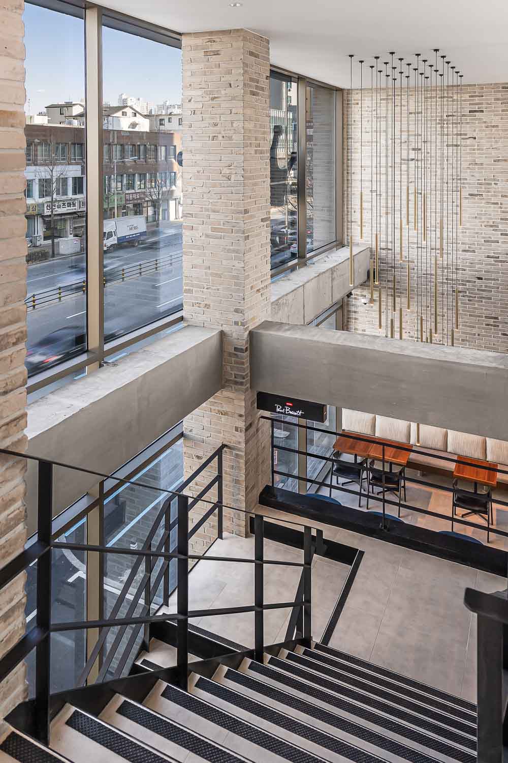 Considering the recognition of commercial buildings, it has an elevation that is as open as possible to the north. The first floor is intended as a main access space for services such as a cafe hall and kitchen, and the second floor interior and the third floor external terrace are intended as spaces where users can mainly stay. From the interior of the 1st floor to the exterior of the 3rd floor, the space where the gaze is directed according to the user’s movements adds a sense of depth of the horizontal space with the brick walls stacked alternately. These walls change the way light is received into the room. The vertical space formed with a high ceiling along the stairs empirically and visually overlaps the spacious cafe space on the second floor and the terrace space on the third floor. The terrace space on the third floor is largely divided into two spaces centered on a staircase, and is open to the south and west sides of the site.
