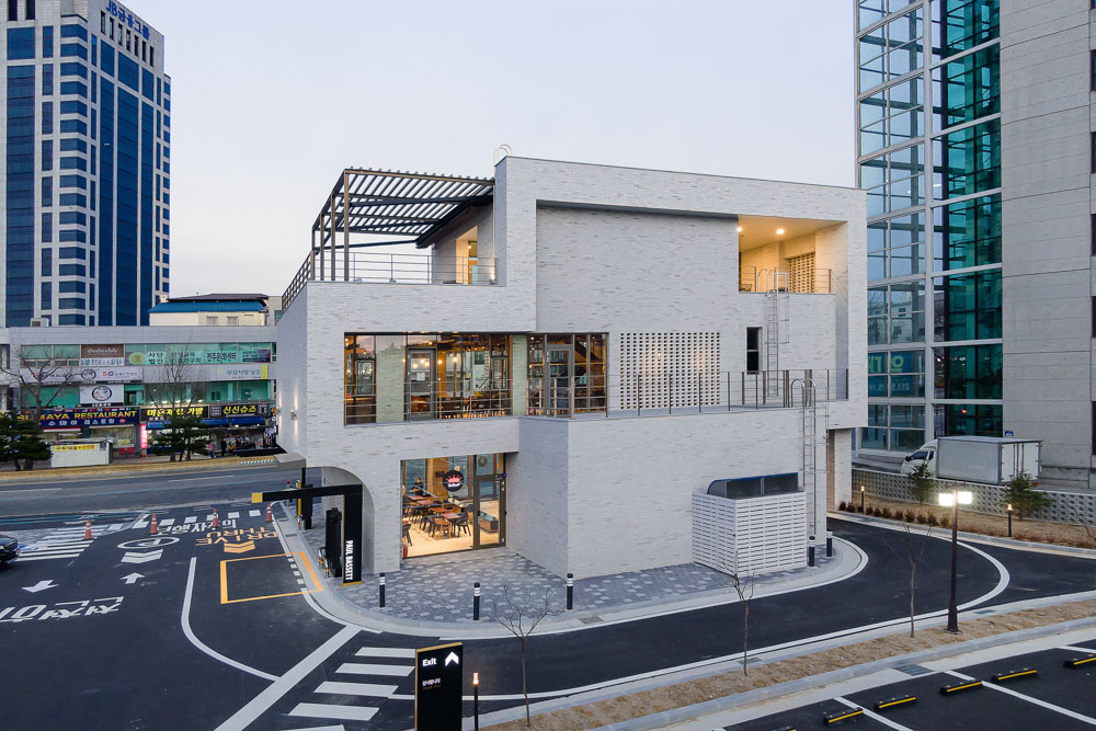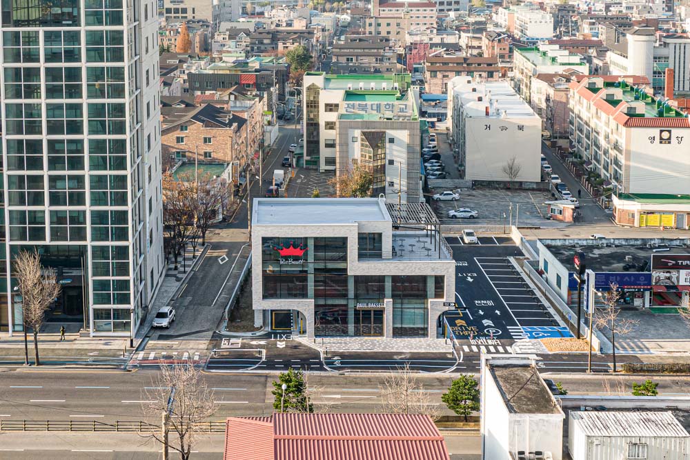 Kirin Road, which runs from Jeonju City Hall, is the oldest road in the city. The site located on Kirin Road is a place with a large amount of traffic and good accessibility due to the surrounding bus terminal, stadium, and university. The Paul Bassett store provides a spatial experience tailored to the two types of users. First, users who access only the exterior of the building by taking a vehicle, and second, users who experience space through time within the building. The first floor is composed of a vehicle passage of a specific length according to the waiting time between orders and goods ready for users accessing through external drive-throughs.