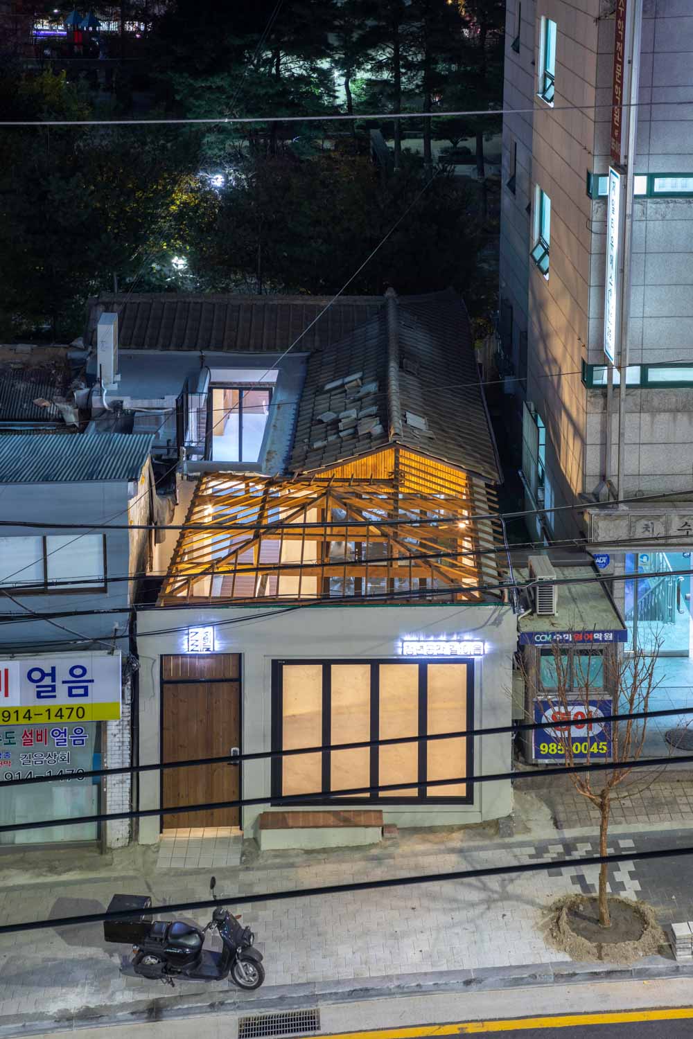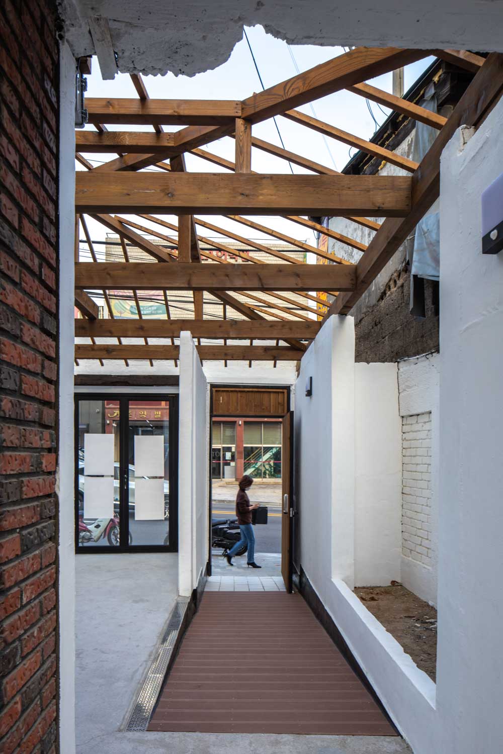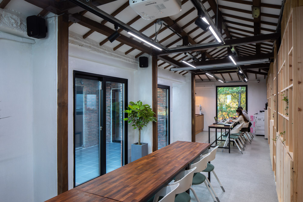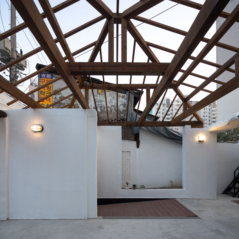 When the roof of the yard was removed, the 60-year-old wooden frame was damaged beyond reuse, maintaining its shape and forming a frame of new wood. The interior space, which was divided into small rooms, consists of a single space, reinforcing the walls with wooden pillars and beams. The existing boiler and floor heating are maintained to minimize the scope of demolition. Wood windows installed on exterior walls are replaced with aluminum windows of the same size, and exterior walls consisting of red bricks and water-based paints are maintained. Steel stairs to the roof also maintain existing structures and reinforce the railings.