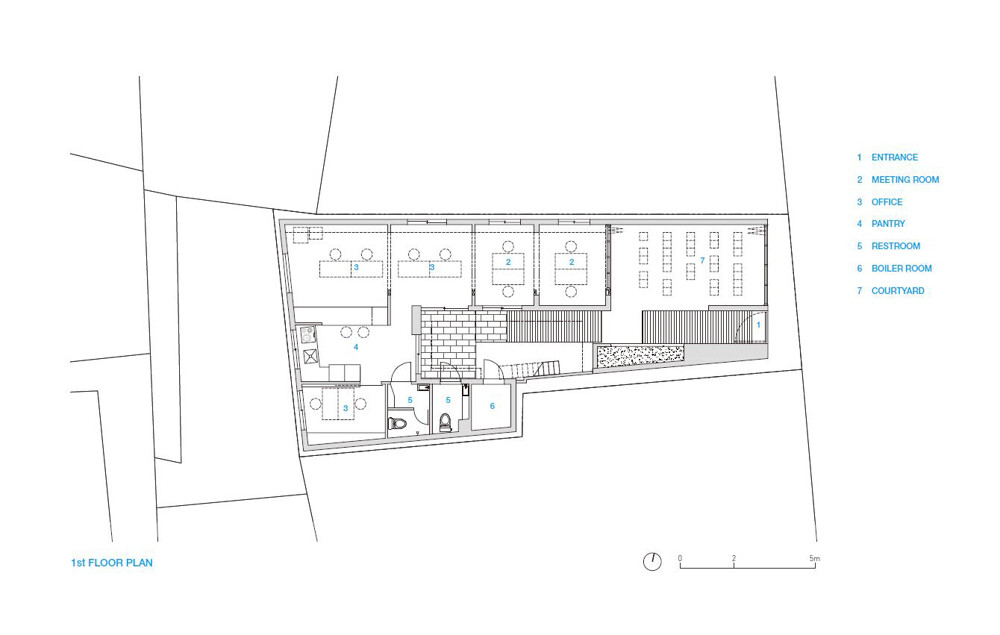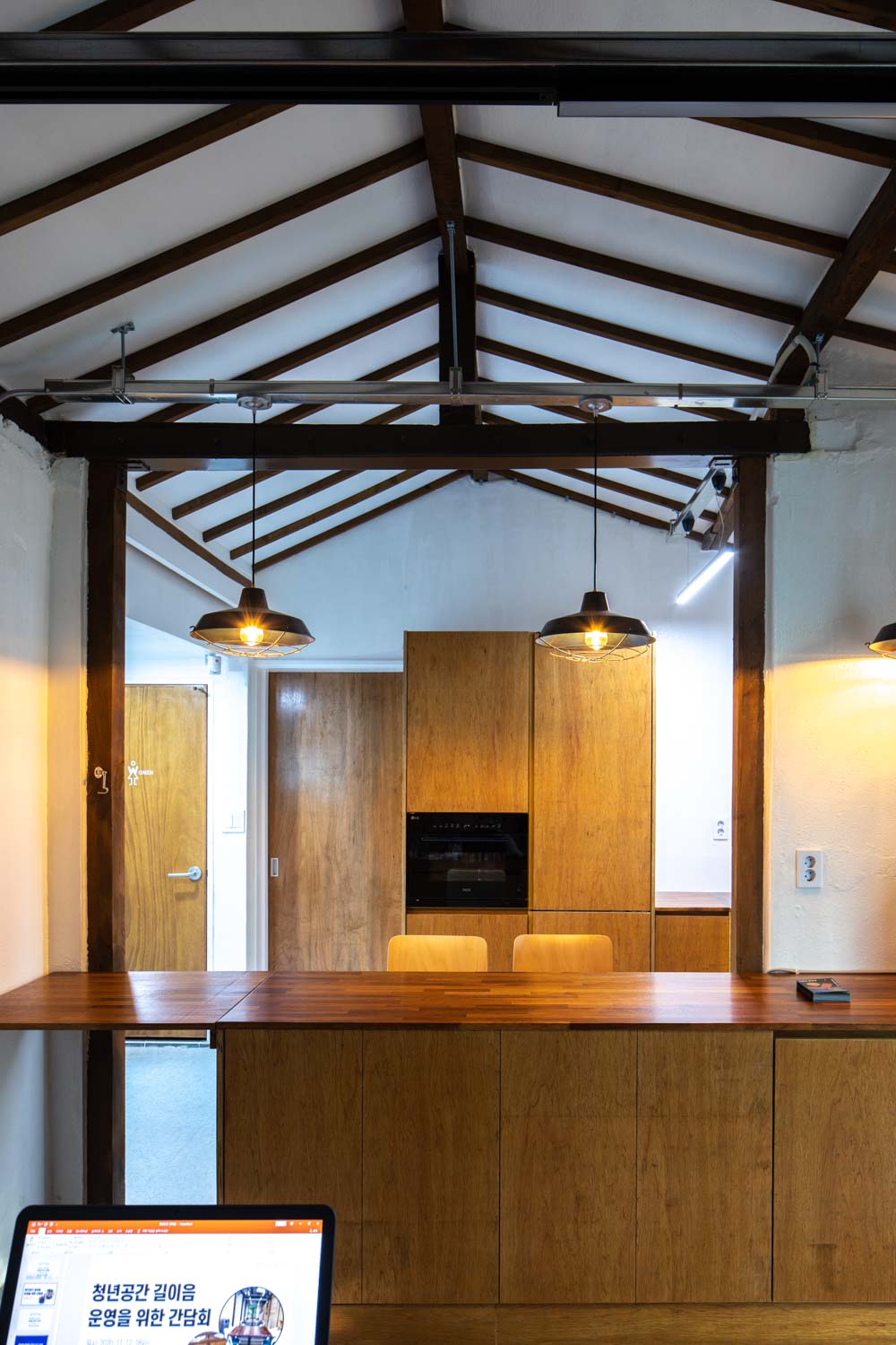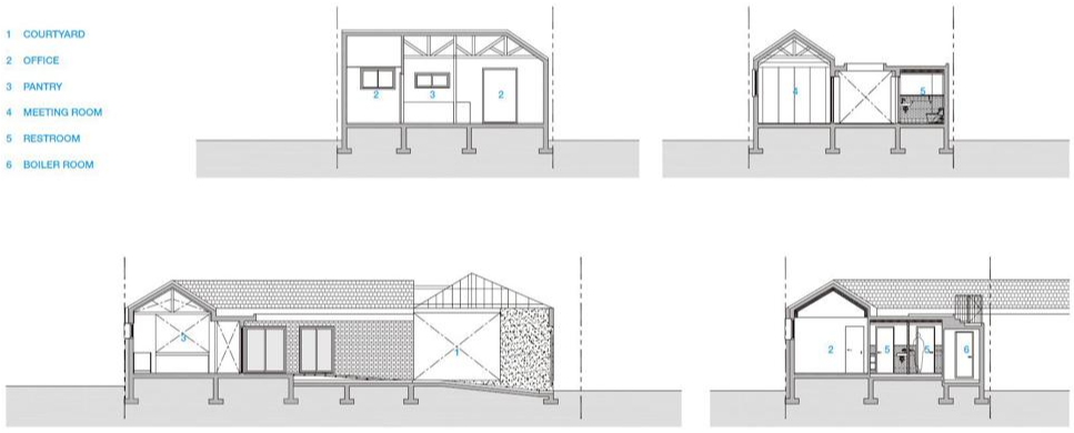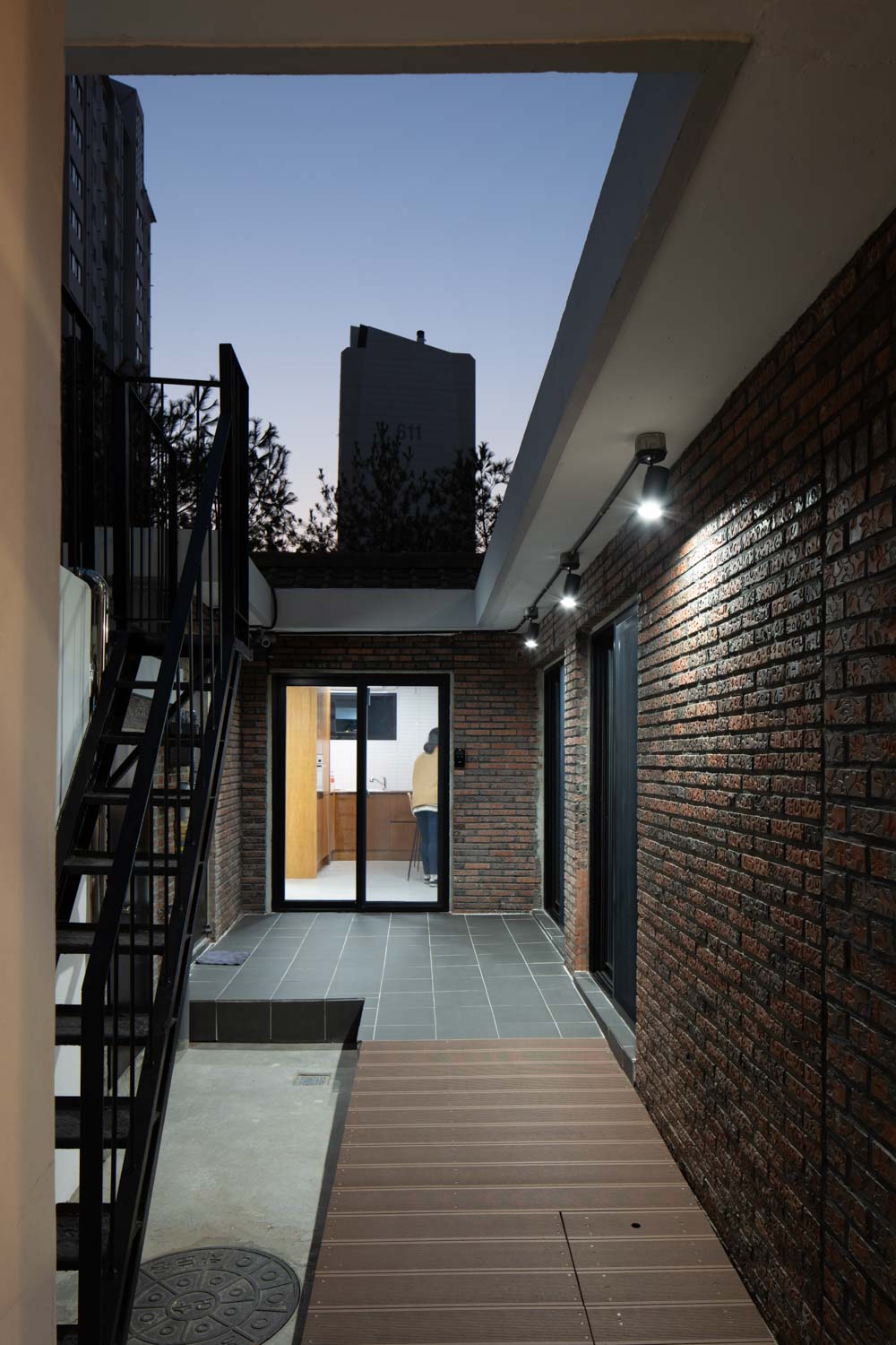 When the roof of the yard was removed, the 60-year-old wooden frame was damaged beyond reuse, maintaining its shape and forming a frame of new wood. The interior space, which was divided into small rooms, consists of a single space, reinforcing the walls with wooden pillars and beams. The existing boiler and floor heating are maintained to minimize the scope of demolition. Wood windows installed on exterior walls are replaced with aluminum windows of the same size, and exterior walls consisting of red bricks and water-based paints are maintained. Steel stairs to the roof also maintain existing structures and reinforce the railings.