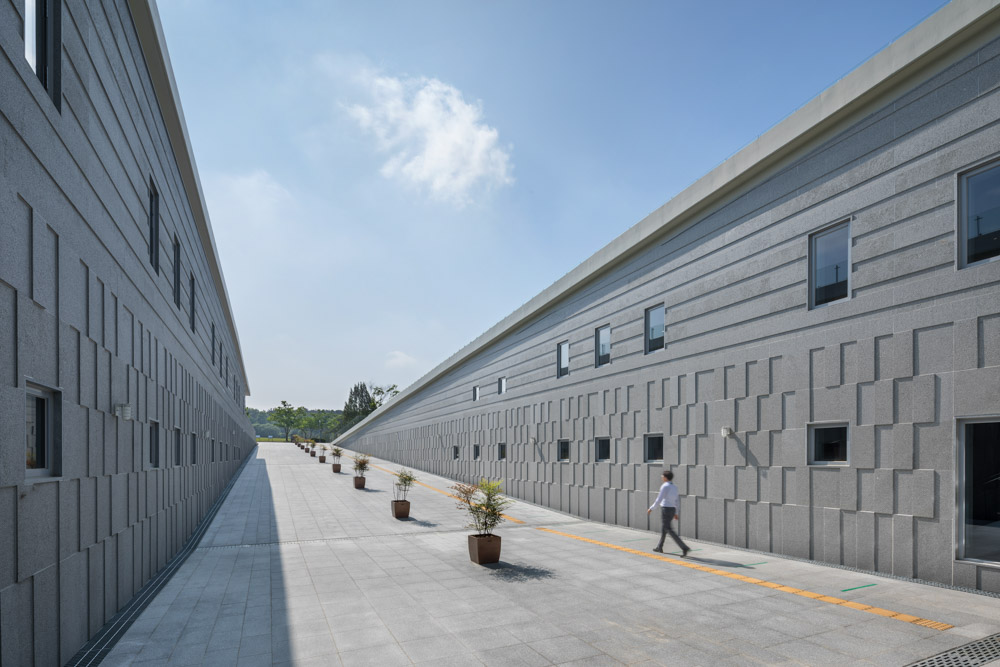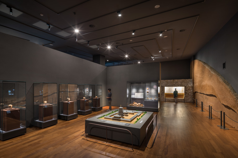 Iksan Mireuksaji Site is a place where the two remaining stone pagodas, the surrounding Yonghwasan, and the south pond are harmonized, and already had a beautiful landscape. The Iksan National Museum has the position of an “invisible museum” that is positioned as an integrated landscape so that the beauty of the Mireuksaji site itself, a world heritage site, is not obscured and can be harmonized. It solidifies meaning as a museum integrated with the surrounding landscape. The exterior of the building contains the spatial structure of the Mireuksaji site, which is located between the left and right ridges south of Yonghwasan, while lowering the height.
