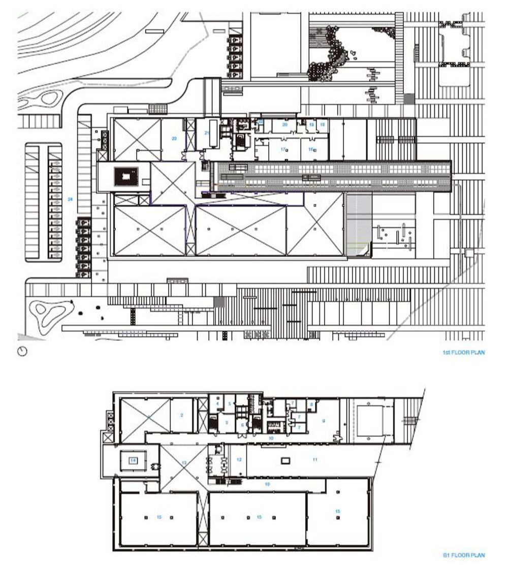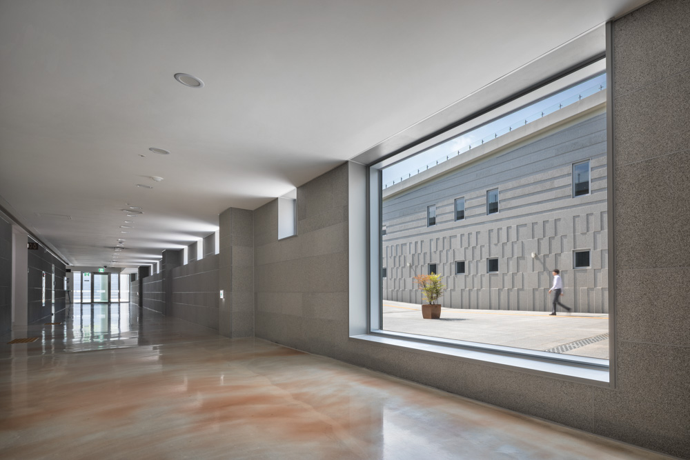 The museum enters the interior of the museum along an inclined path to the first basement level 35m above sea level through the lamp on the east side facing Mireuksaji. Experience architecture as a landscape, the process of naturally approaching the interior along the road, and exhibitions, climbing on the roof and imagining the glorious Mireuksaji site in the past, and experiencing the exploration of the time of history for viewers. It is space. At the start of the ramp, the boundary between the ground and the basement of the museum begins. The boundary divided by the slabs of the inner space becomes an artificial hill at the point facing the outer boundary of the museum mass and rises from the ground, and the inner facade facing the ramp expresses the boundary between the ground and the basement through a change in pattern.
