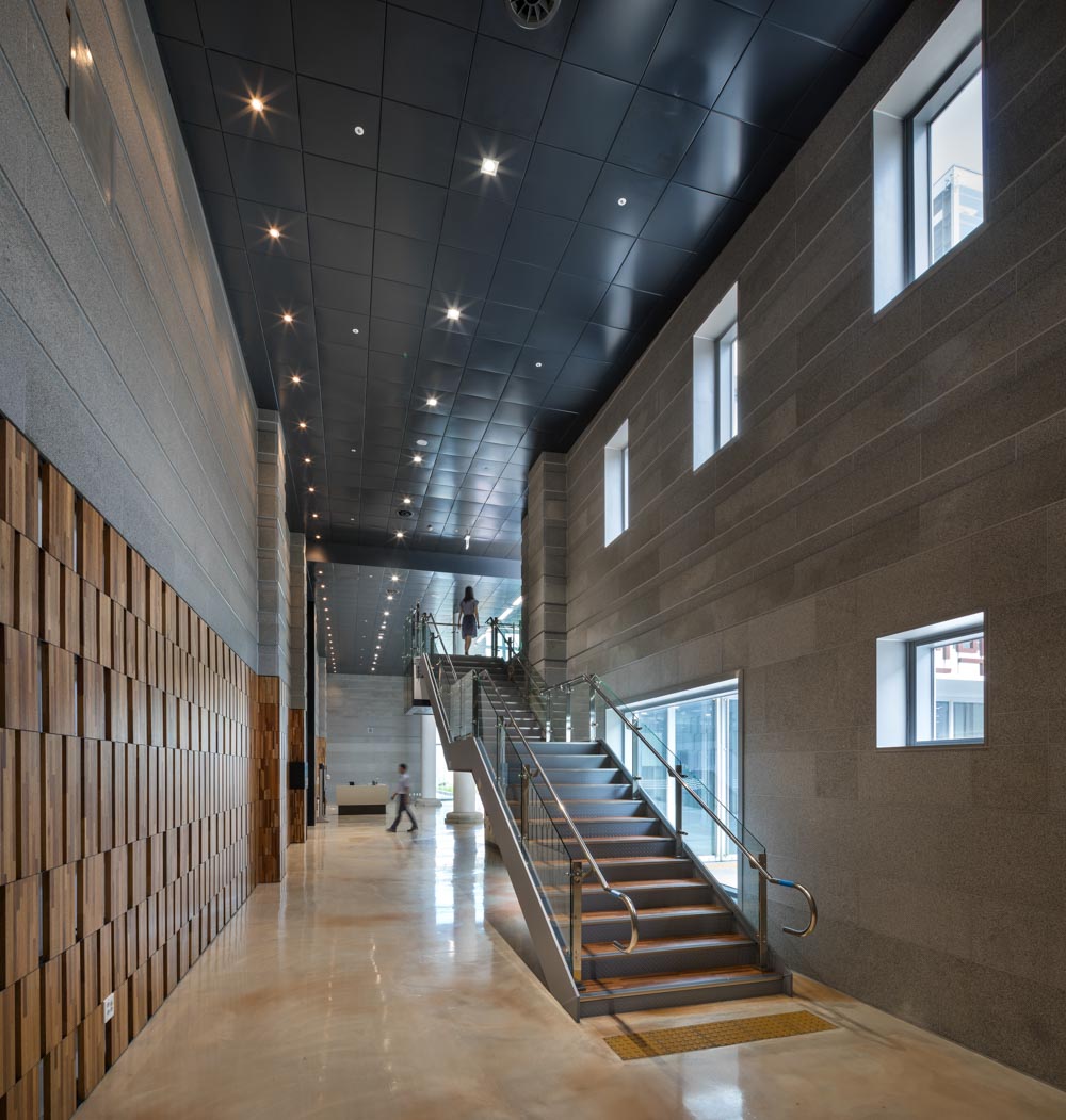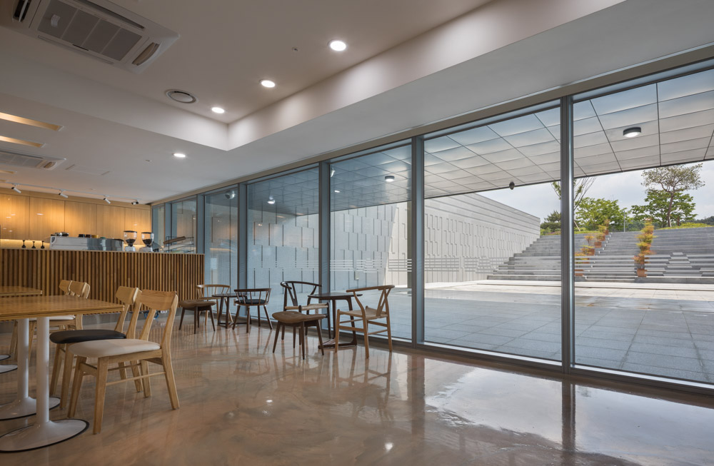 The museum enters the interior of the museum along an inclined path to the first basement level 35m above sea level through the lamp on the east side facing Mireuksaji. Experience architecture as a landscape, the process of naturally approaching the interior along the road, and exhibitions, climbing on the roof and imagining the glorious Mireuksaji site in the past, and experiencing the exploration of the time of history for viewers. It is space. At the start of the ramp, the boundary between the ground and the basement of the museum begins. The boundary divided by the slabs of the inner space becomes an artificial hill at the point facing the outer boundary of the museum mass and rises from the ground, and the inner facade facing the ramp expresses the boundary between the ground and the basement through a change in pattern.