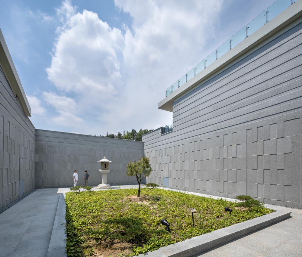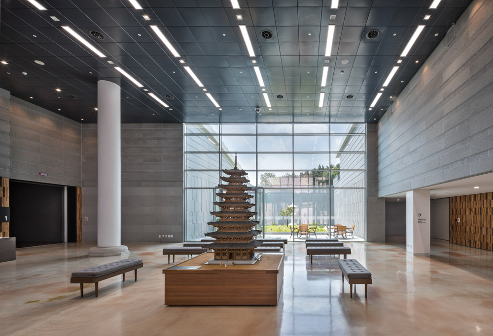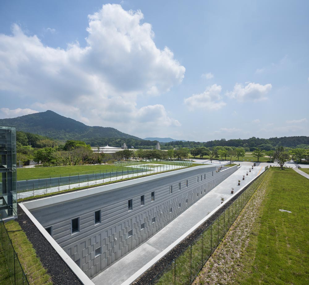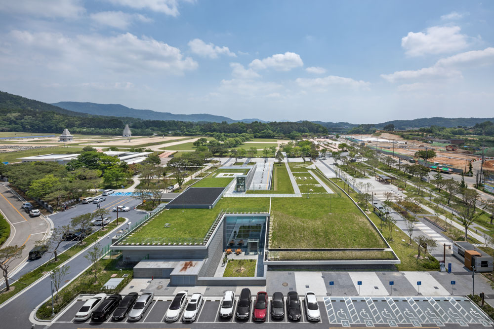 Iksan Mireuksaji Site is a place where the two remaining stone pagodas, the surrounding Yonghwasan, and the south pond are harmonized, and already had a beautiful landscape. The Iksan National Museum has the position of an “invisible museum” that is positioned as an integrated landscape so that the beauty of the Mireuksaji site itself, a world heritage site, is not obscured and can be harmonized. It solidifies meaning as a museum integrated with the surrounding landscape. The exterior of the building contains the spatial structure of the Mireuksaji site, which is located between the left and right ridges south of Yonghwasan, while lowering the height.