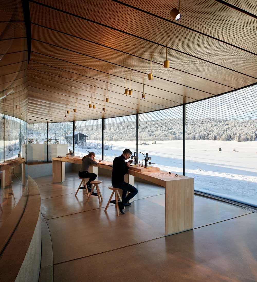 지역 경관과 완벽하게 통합되는 형태의 새로운 지역의 랜드마크가 된 이 건물은 현대적으로 해석됐으면서도, 기존의 건축물과의 조화를 이뤄내 시대를 초월한 건축물로 인식되기도 한다. 오래된 건물과 새로운 공간의 직관적인 배치는 곧 관람객을 위한 이 시계 브랜드의 스토리 라인으로 이어지며, 시계 제작의 예술과 과학적인 의미의 공간으로 다가선다. 모든 요소는 전시회의 기능적 요구 사항에 따라 결정되고, 한 번의 큰 형태적 제스처가 눈에 띄는 조형적 공간으로 곳곳에서 나타난다.