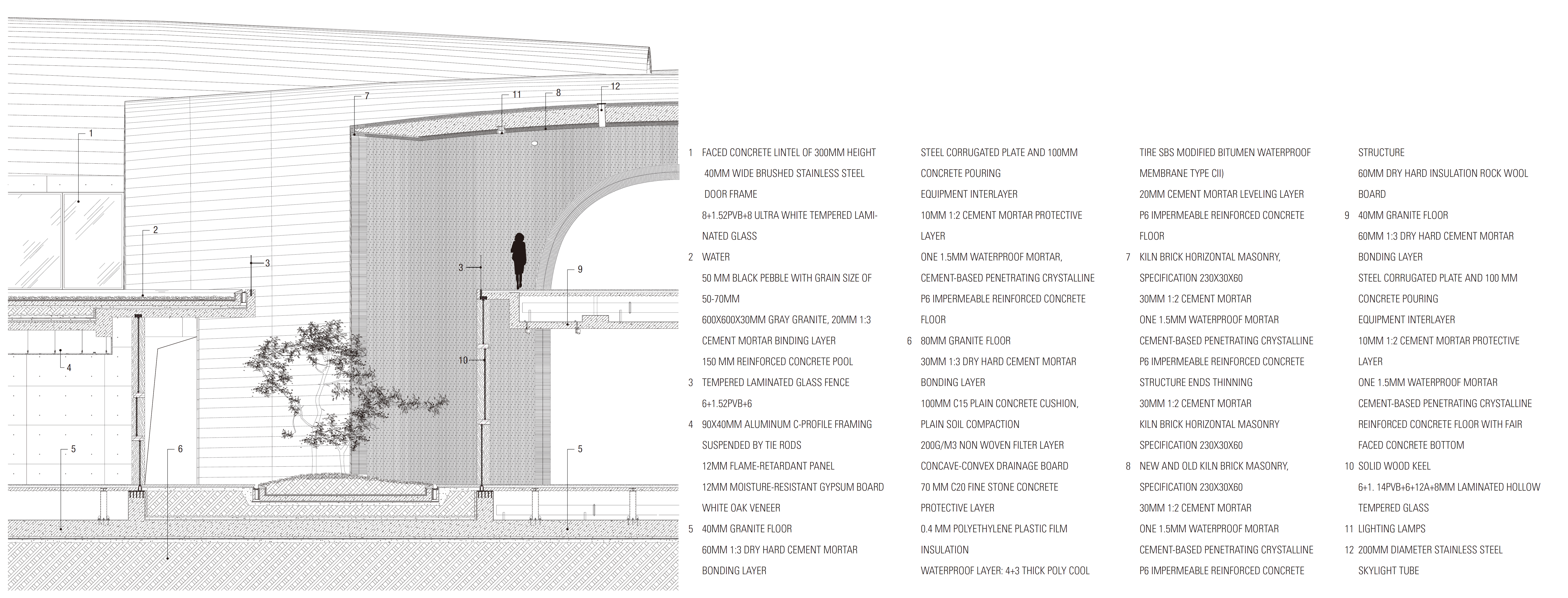 The museum is accessed via a forecourt, as visitors walk across the bridge, enter the foyer and turn left, they will pass a series of arched spaces of temporary and permanent exhibitions. Waking down through a bare concrete stairway to the underground level, visitors are present with five sunken courtyards that are slightly varied in size. All of the porcelains, ruins, sunken courtyards, along with the ancient bricks and façade, create a multi-layered museum experience for visitors. As you turn right at the foyer, you will respectively pass the bookstore, cafe, tea room and finally reach a semi-outdoor area under the arch with a picturesque scene: the rough surfaces of the arches reflect the waves of water during daytime, the low horizontal opening invites visitors to sit down, presenting them with a surprising view of Imperial Kiln Ruins. A Similar kind of surprise would be found on the way to the auditorium, peeking through the vertical seams, visitors can see the Longzhu Pavilion of the Imperial Kiln Ruins.