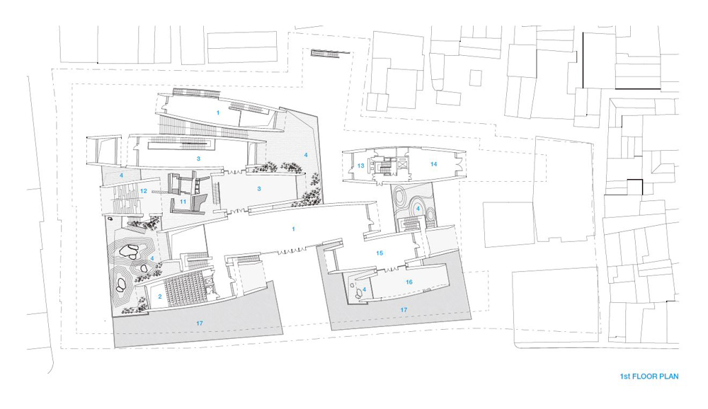 주변 역사적 건물의 높이를 고려할 때, 이 계획은 주변 건물들의 수평적 기준을 모호하게 만든다. 건물이 부지의 지면에 들어서면 일련의 공공 공간이 만들어지고 방문객들은 친숙한 여러 개의 아치형 지붕과 박물관 내부로 움푹 파인 안뜰을 이용할 수 있게 된다. 대부분의 아치형 지붕은 뒤쪽과 앞쪽이 열려 있어 징더전의 덥고 습한 여름 날씨를 피할 수 있는 장소로 제공된다. 개방된 공간들 중 하나에서 방문객은 고대 가마의 흔적을 볼 수 있다.