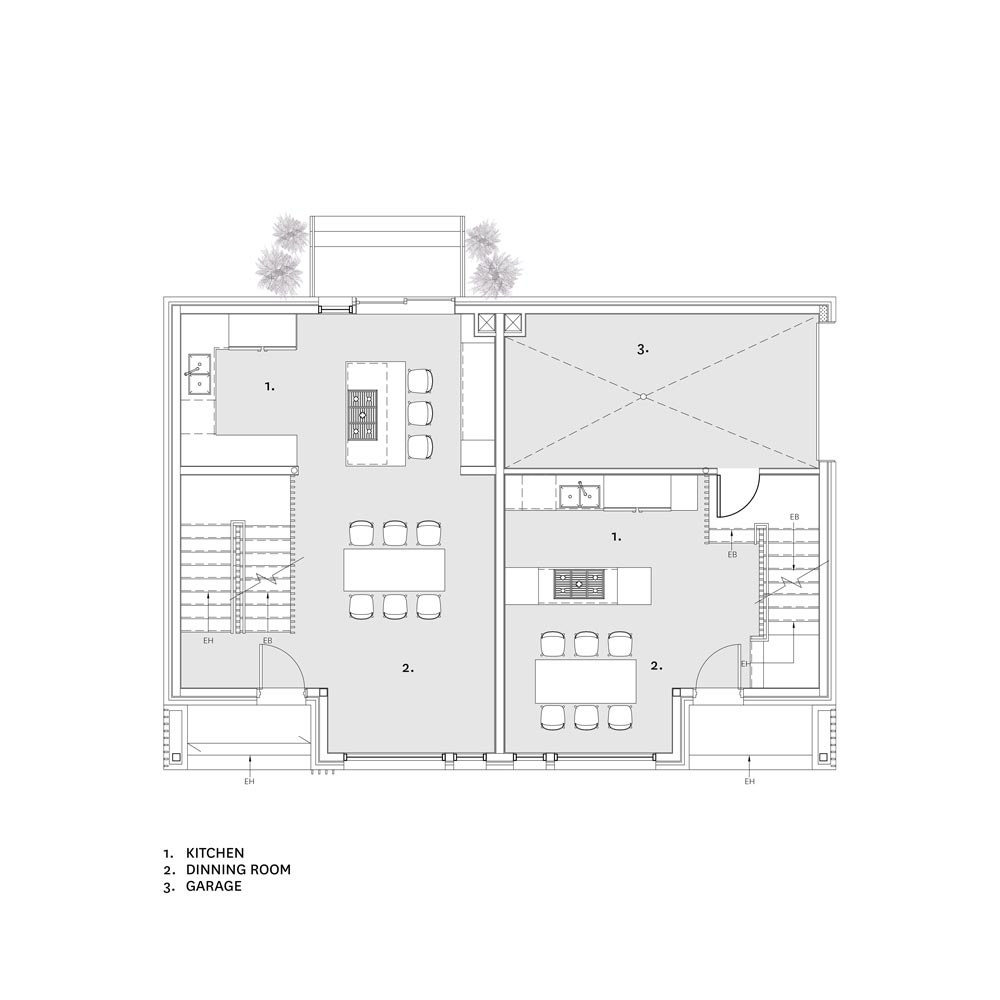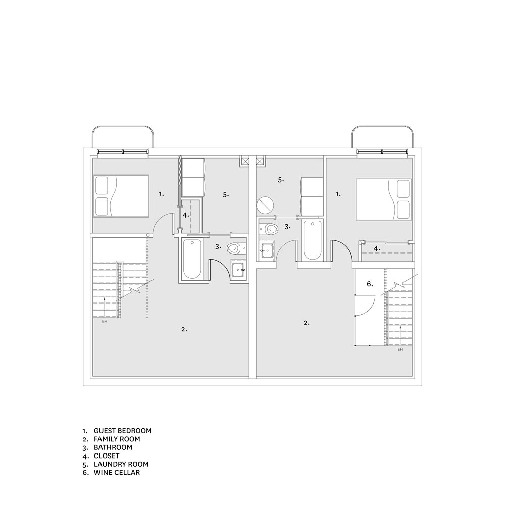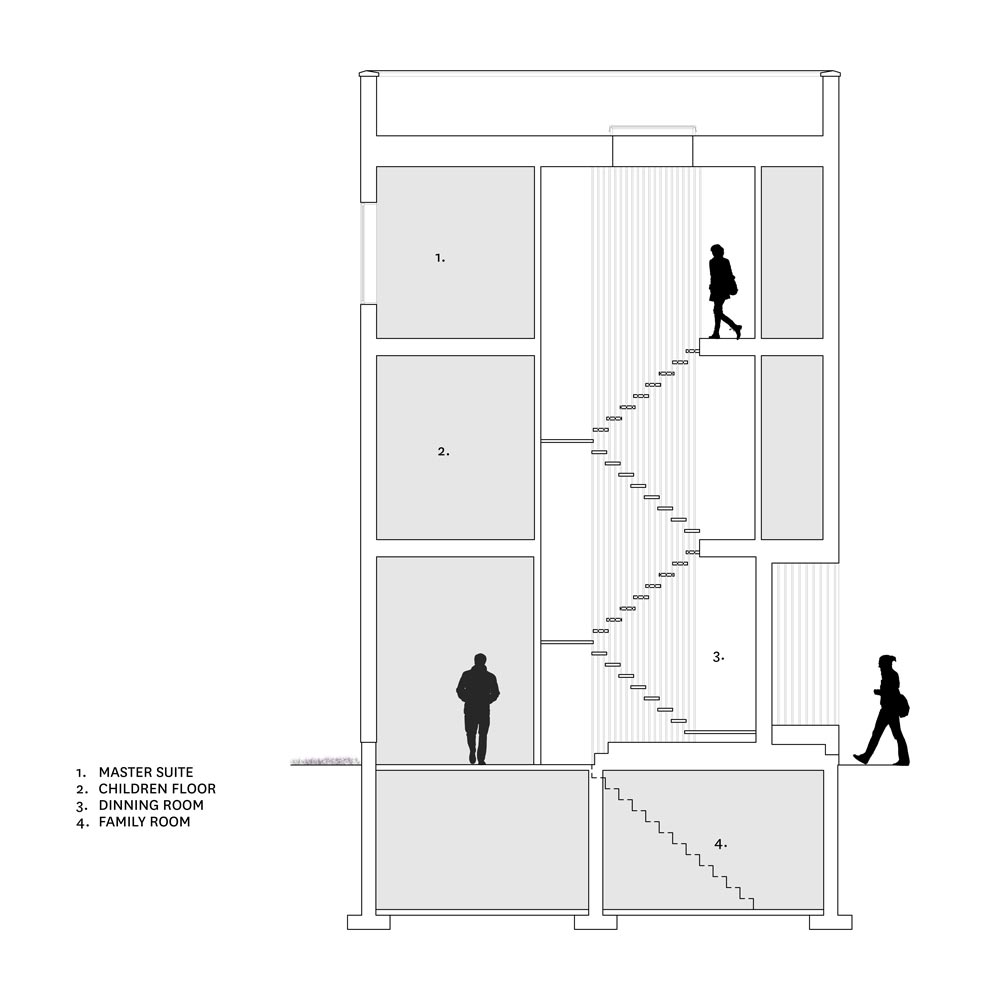 가족생활 공간은 1층에 있다. 지하실과 거실 공간, 추가적인 침실 및 세탁실이 있다. 어린이용 침실은 2층에 있고 그 위에는 옥상 테라스를 이용할 수 있는 안방이 있어 개인을 위한 야외 휴식을 제공한다. 침실에 포함된 유리로 된 욕실도 주요한 부분이다.