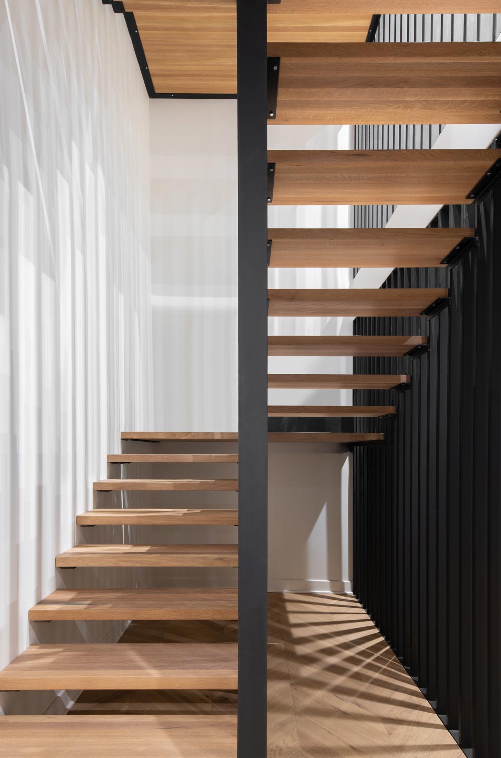건물에 들어서면 계단을 먼저 마주한다. 이 수직적 요소는 주택의 중심축이자 다양한 층을 연결하는 랜드마크 역할을 한다. 이 건축 요소의 이면에 위치한 아이디어는 숲의 나무에 동조하는 것에 있다. 나무줄기에서 영감을 얻은 계단은 슬랫이 전체를 구성하며, 끝에는 하늘의 빛이 공간을 비추고 빛과 그림자의 재미있는 놀이를 제공한다.