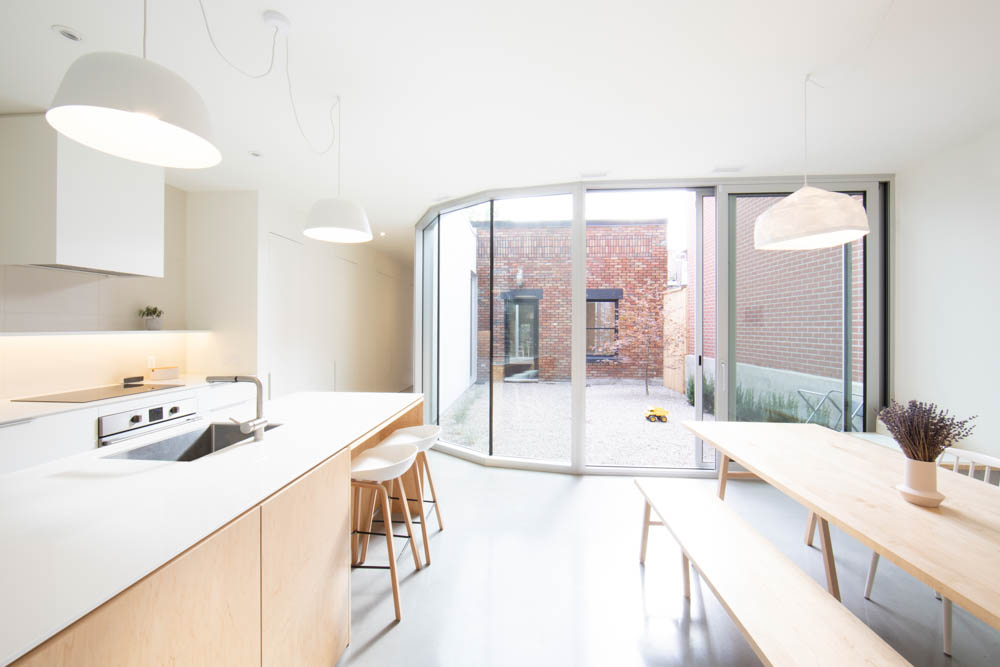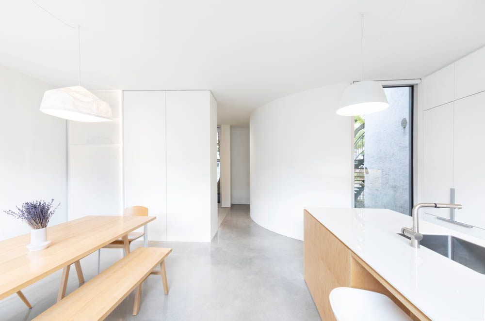 The house’s new front yard - mid yard - back yard structure clearly defines the home’s internal configuration. Quiet spaces such as the bedroom and living room are reorganized within the original masonry and wood structure at the rear of the lot where more intimate windows and lower ceilings are ideal for private, insulated environments. The more boisterous family spaces move up front, street side. They are large and open, punctuated by the clean geometry of sculpted forms (cube and a cylinder) that define the generous entrance. The kitchen-dining room is very much at the social head of the new house – all at once communal family workspace and assembly hall. Large glazing offers a physical and visual connection to the central garden and back to the house’s original façade.