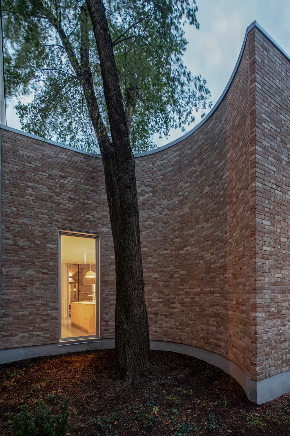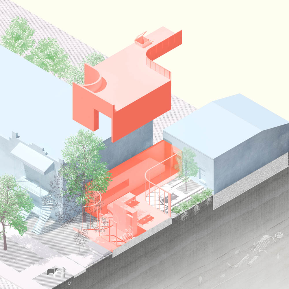 볼륨 계획은 단계적으로 발전했다. 첫 번째로 인접한 이웃 건물의 전면에 맞추기 위해 확장의 영역을 앞쪽으로 옮겼다. 파사드의 연속성을 방해하는 시베리아산 느릅 나무 주변에 보호 공간을 조성하기 위해 파사드를 깎았다. 이 동떨어진 볼륨은 동쪽의 벽을 따라 이어지는 복도를 통해 주택과 연결된다. 이 공간은 주방, 화장실, 창고, 세탁 공간이 통합되어 있으며, 기계적으로 낡은 것과 새로운 것을 연결한다. 복도의 외벽은 전면 파사드에 나무가 잘 비치는 곡선이 어우러져 본래의 집을 보여주는 중정을 강조한다.