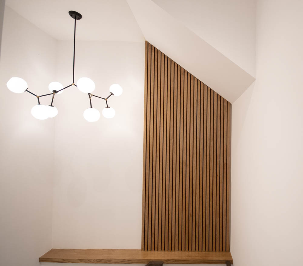 The interior stairs are crafted from oak panels, matched by similarly pre-engineered oak floors and handrails lighted up by the skylights.