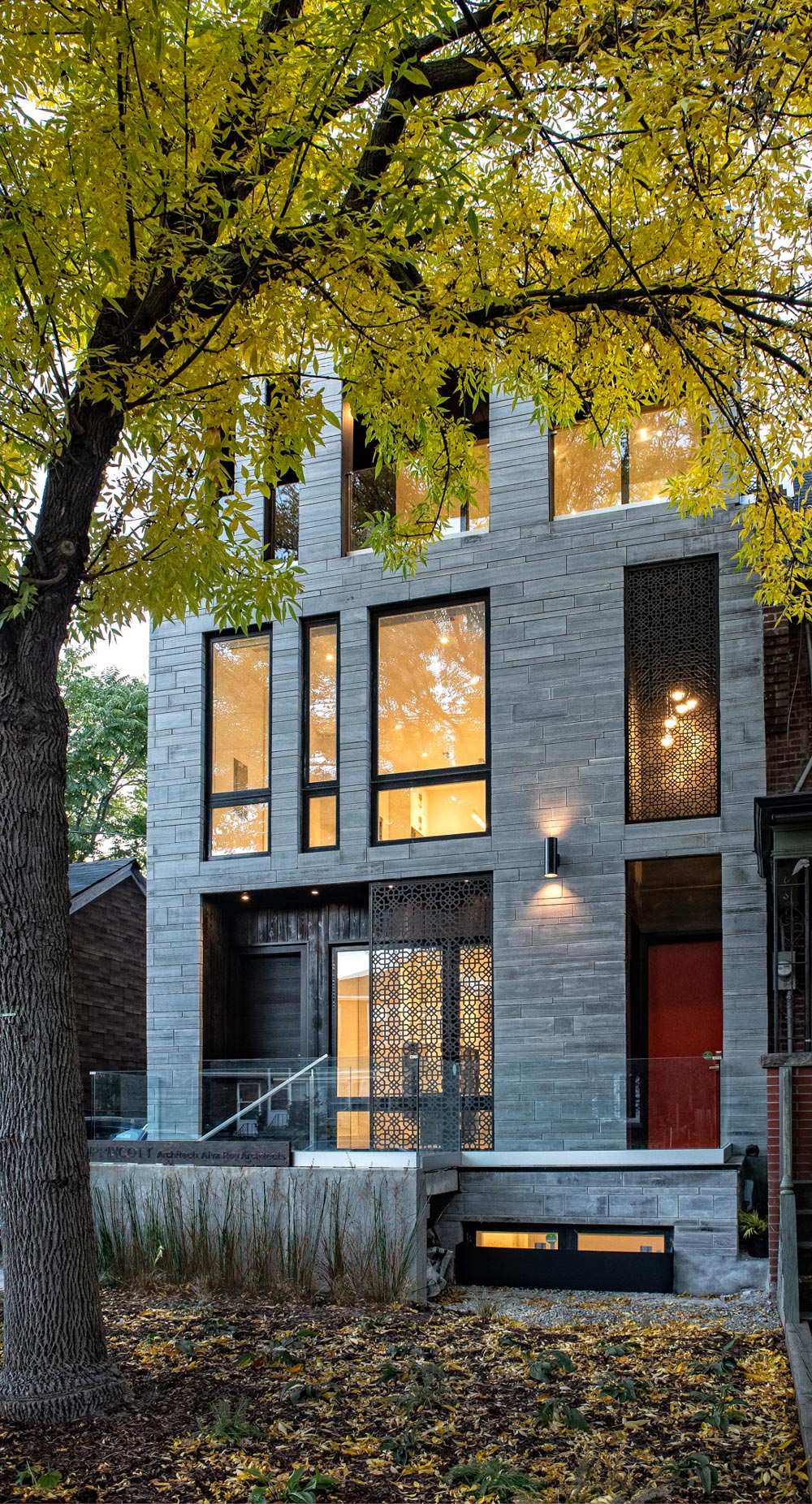 Designed to carefully integrate into the surrounding streetscape, the house presents as an appropriate and contextually scaled three-story structure with a combination of rich and natural materials that predominate the façade of the building. The Combination of six sides sawed Eramosa stone and Shou Sugi Ban cedarwood are complemented by porcelain floor tiles and anodized aluminum laser cut screen walls.