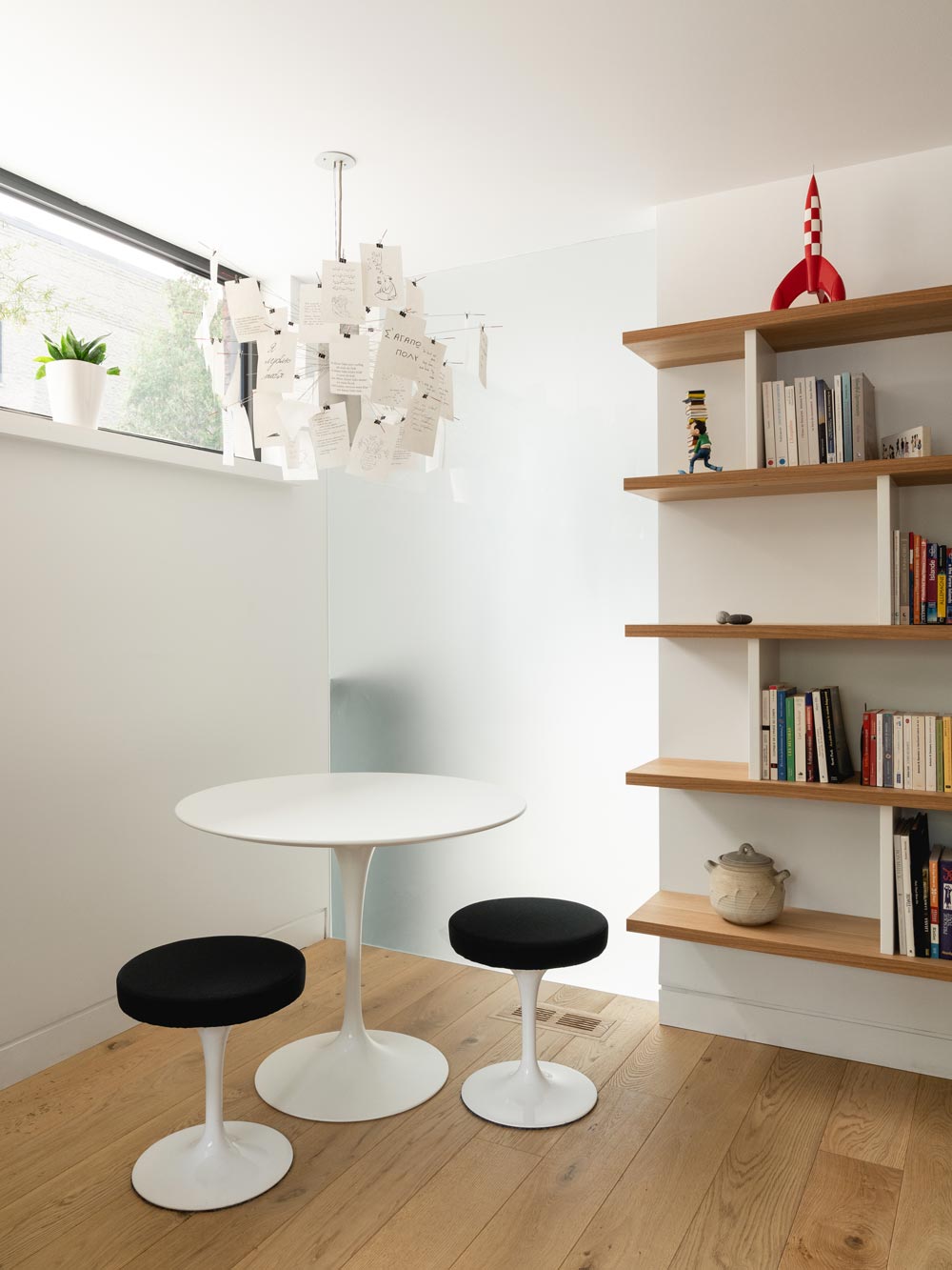 Several new openings have been made in the exterior walls to illuminate the space at any time of the day. They also opened the floor to create a large double-height space for the new staircase, thus reinforcing an impression of continuity between the two levels. A large piece of satin glass between the office and the stair allows these spaces to benefit from the light coming from the neighboring space while ensuring privacy.