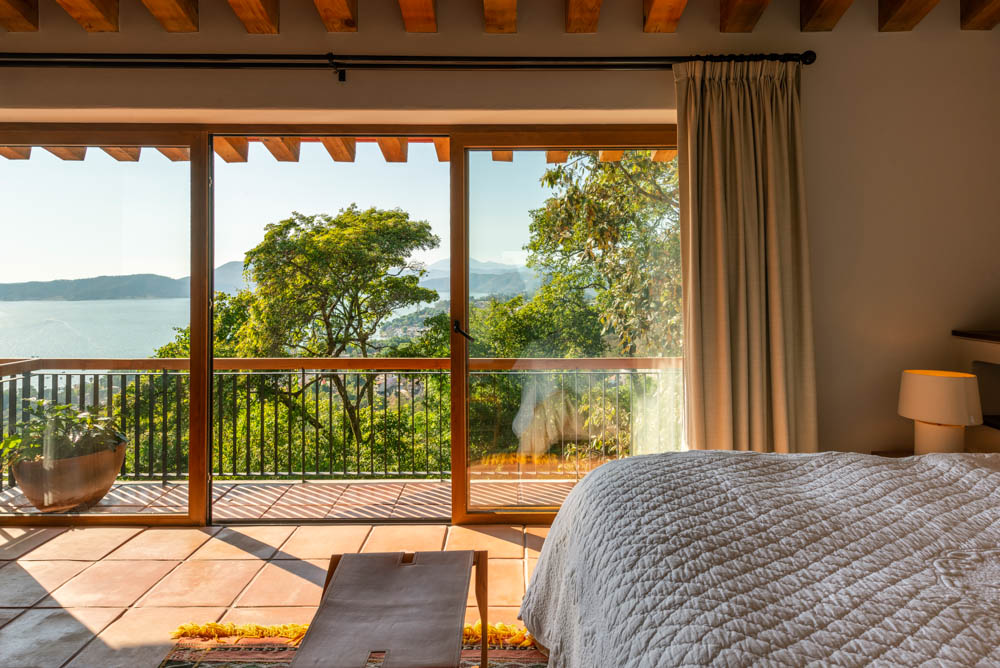 The dining room opens onto the terrace and the interior patio being ventilated and well lit. The interior patio is the place where the sun shines in the morning and one can go out for coffee and warm-up, or on the other side, take refuge from the sun of the west during the afternoon. It is a monastic place, without a view, but surrounded by vegetation, giving the tranquility and peace to rest in a hammock. Finally, the living room and dining room can be opened with sliding windows to integrate the terrace, as well as the backyard.