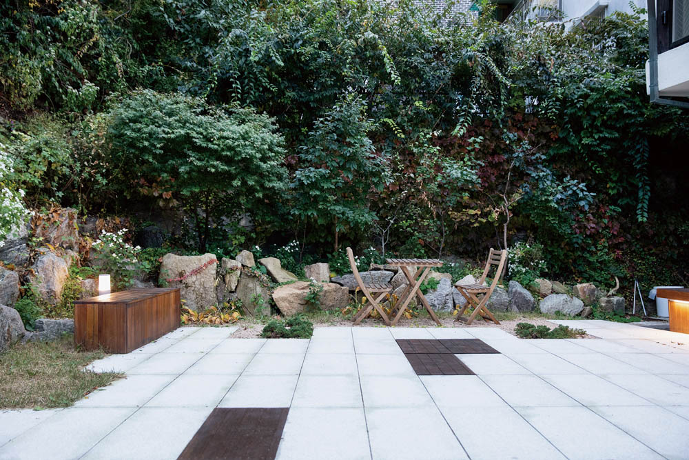 외관은 있는 그대로 깨끗하게 정리를 하고, 내부는 기능적인 부분의 보완 및 스타일링만 했다. 마당에 산을 바라볼 수 있는 평상, 현관 앞쪽에 낮은 긴 계단을 두어 앉을 수 있도록 했다. 마당 중앙 공간은 어떤 조경을 하기 보다 깨끗한 종이처럼 바탕이 되는 공간으로 만들었다. 사는 사람의 생활을 담고, 산을 담는다. 산 앞에서 어떤 조경을 디자인하는 것이 의미가 없다고 생각했다. 마당 한 켠에 베어진 나무 그루터기도 그대로 두어, 의자로 사용하고, 그 옆에는 집을 바라볼 수 있는 벤치를 설치했다. 어디든 앉을 수 있고, 어디를 바라보아도 자연인 집이다.