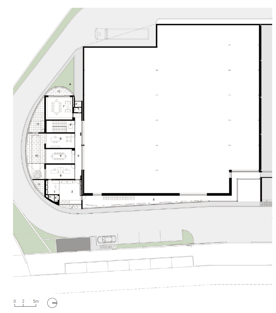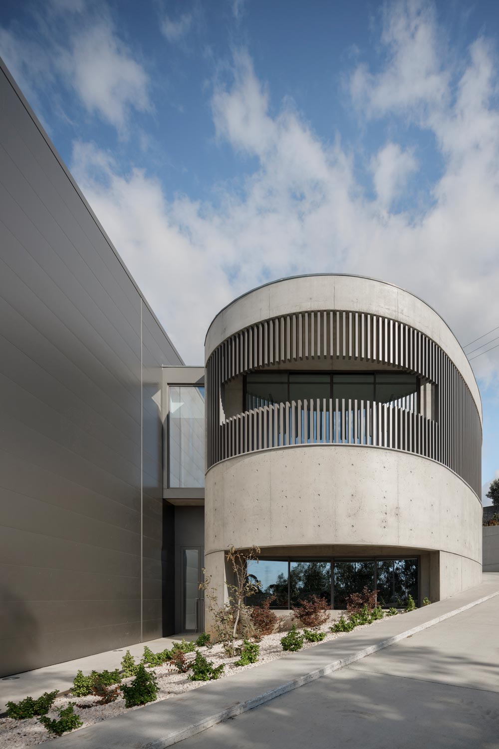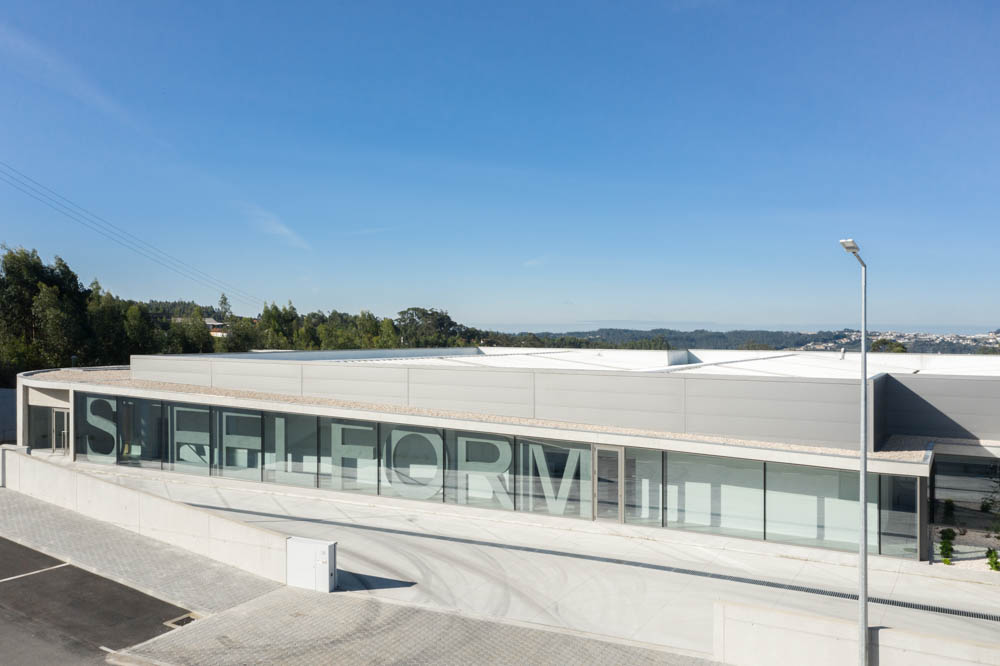 The site’s configuration contributed to the adopted solution, which sought to maximize the area of the industrial nave, leaving the southern part of the site for the administrative area. This area lies along the new proposed street, giving rise to a curved concrete building, marked by vertical aluminum profiles, which sought to differentiate itself from the industrial volume, highlighting its function as an administrative area. The east corridor, which covers the industrial nave, connects the administrative area to the existing building. With a strong plastic component, relating to the mold industry, it sought, by means of its language, to convey a concept of contemporaneity while associating the company’s brand.