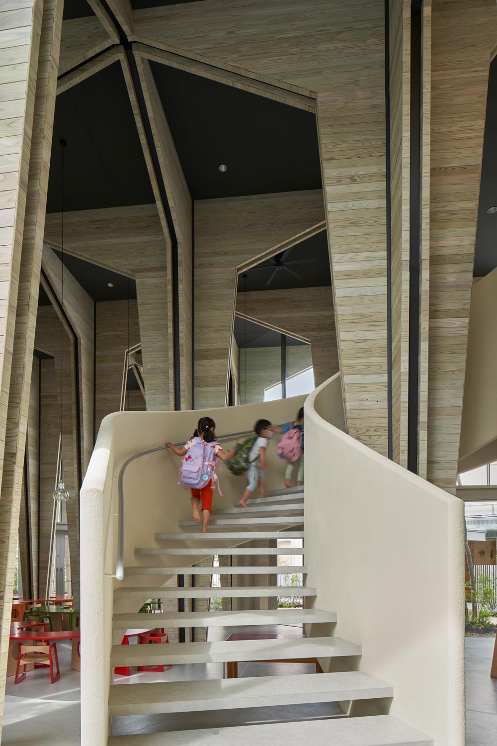 게다가 유아와 성인은 공간을 다르게 인식하기 때문에, 각각이 공간을 이해하고 상호작용하는 뚜렷한 방법이 있다. 이러한 구조적이고 역동적인 환경 속에서 아이들이 특별한 방법으로 상상력과 호기심을 기를 수 있는 독특한 공간을 만드는 것을 목표로 했다. 내부는 페인트 칠한 석고보드로 벽과 천장을 마감하고 오텍스(Autex) 패널은 교실과 직원 사무실 전체를 편안한 분위기로 만든다. 사물함은 전체적인 건축 디자인 및 건물의 형태와 어울리도록 디자인되어 있다. 교실들은 각 연령 그룹마다 필요한 조건들을 충족하면서 친밀한 학습환경을 아이들에게 제공한다.