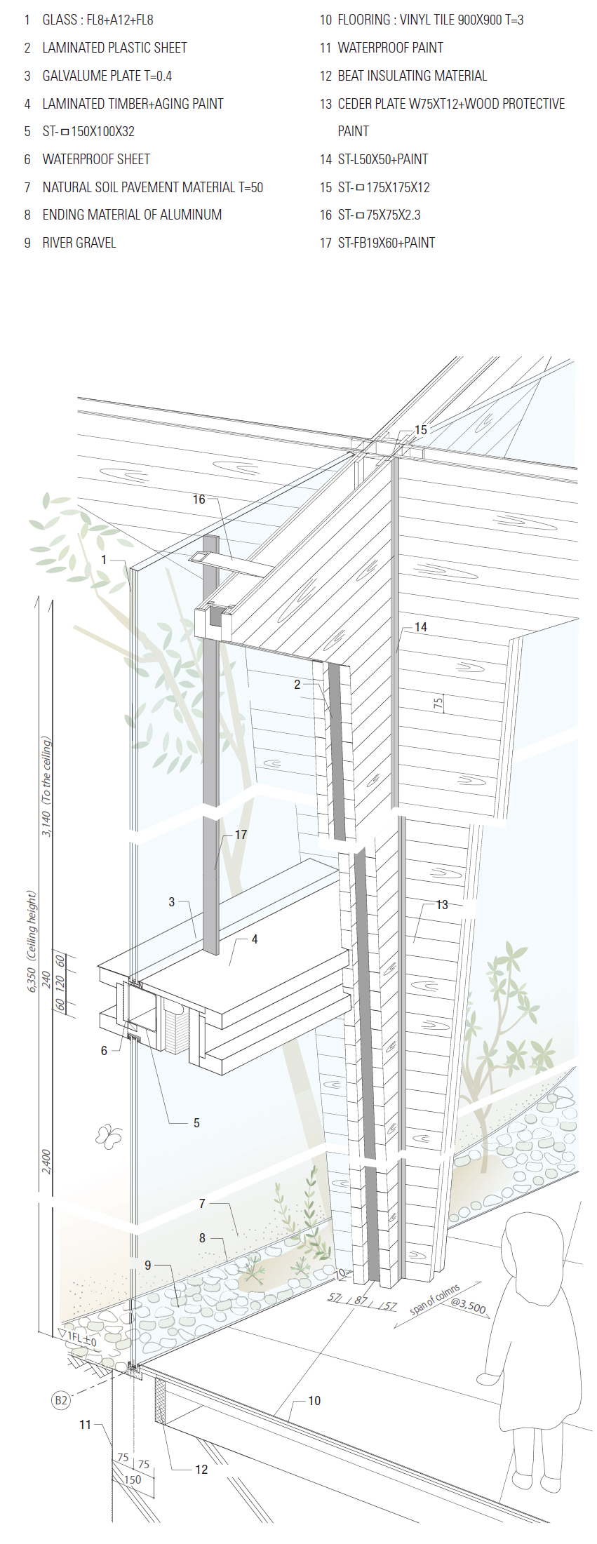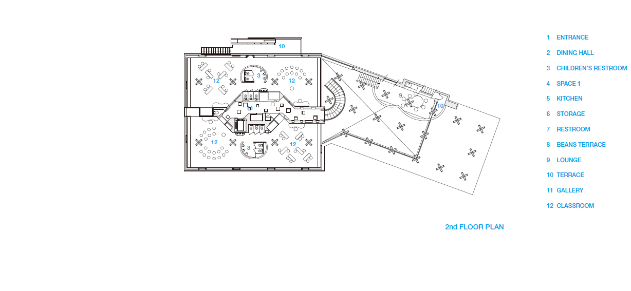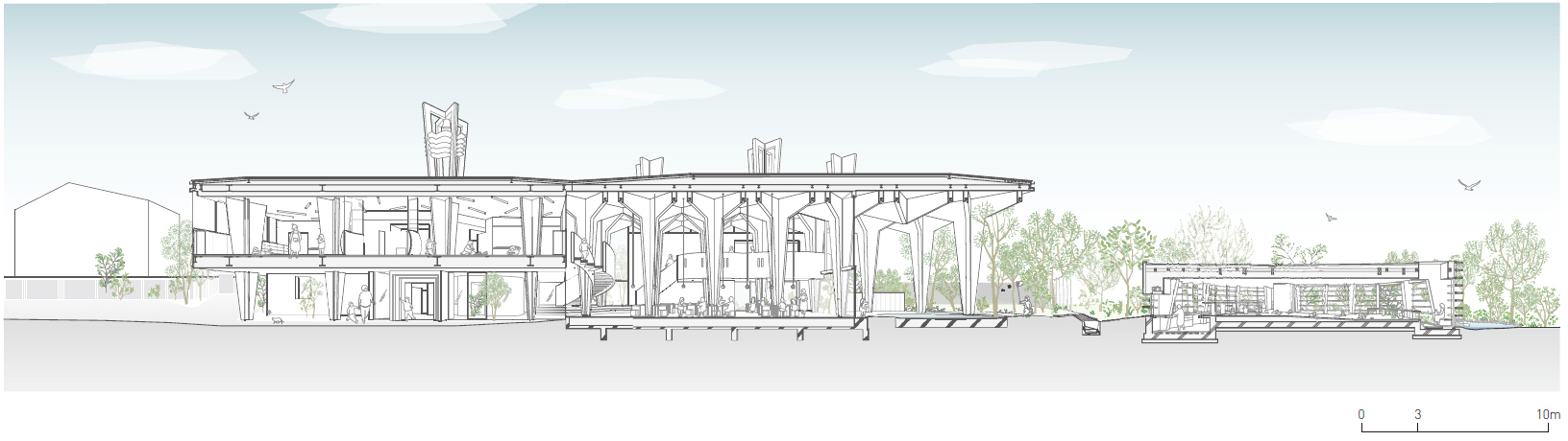 건축가는 식당을 위해 여러 가지 방법으로 사용할 수 있는 열린 빈 공간을 디자인하는 것을 의도적으로 피했다. 오히려 건축 강도를 더하는 기둥과 보를 이용해 구조와 질서를 더했다. 이렇게 식당은 천장을 향해 넓어지는 십자형 보와 기둥이 배치됐다. 그것들은 3.5m 간격으로 격자 배치로 배열되어 있고 45도 회전한다. 수평 및 수직 앵커의 사용을 통해 점진적인 깊이감이 생성되며 물리적 거리에 대한 인식을 생성한다. 가구와 조경디자인의 활용을 통해 내부 공간과 외부로의 원활하고 점진적인 전환을 만들어, 자유롭게 돌아다닐 수 있는 숲 속 같은 환경을 조성한다.