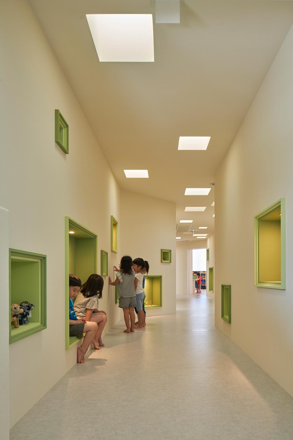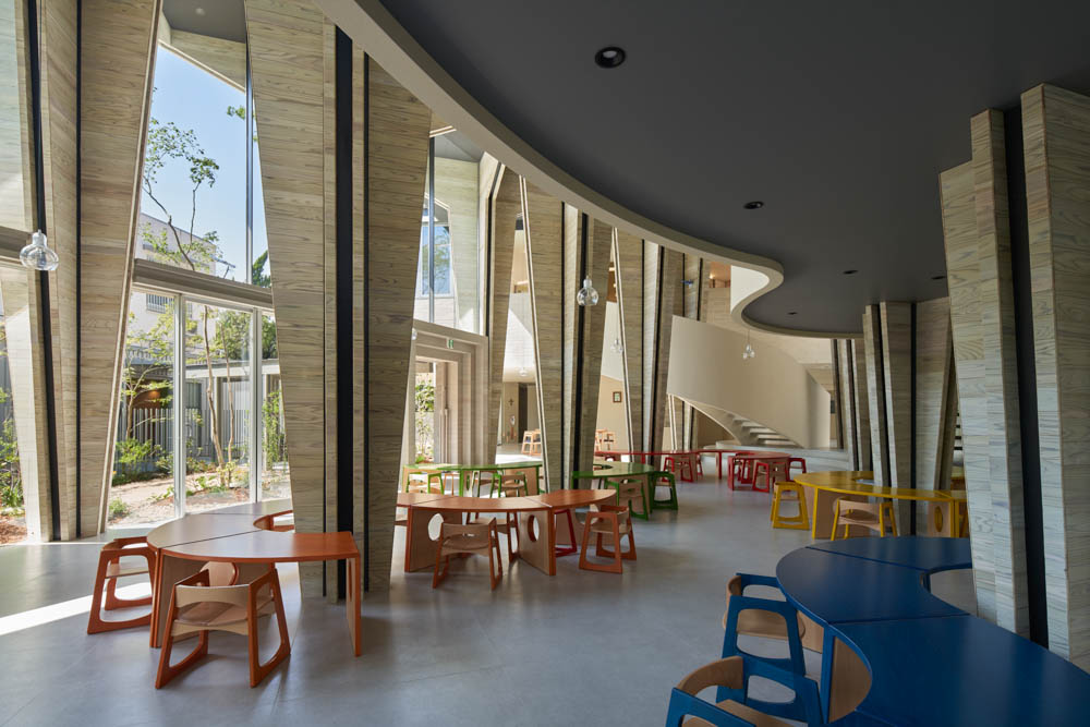 게다가 유아와 성인은 공간을 다르게 인식하기 때문에, 각각이 공간을 이해하고 상호작용하는 뚜렷한 방법이 있다. 이러한 구조적이고 역동적인 환경 속에서 아이들이 특별한 방법으로 상상력과 호기심을 기를 수 있는 독특한 공간을 만드는 것을 목표로 했다. 내부는 페인트 칠한 석고보드로 벽과 천장을 마감하고 오텍스(Autex) 패널은 교실과 직원 사무실 전체를 편안한 분위기로 만든다. 사물함은 전체적인 건축 디자인 및 건물의 형태와 어울리도록 디자인되어 있다. 교실들은 각 연령 그룹마다 필요한 조건들을 충족하면서 친밀한 학습환경을 아이들에게 제공한다.