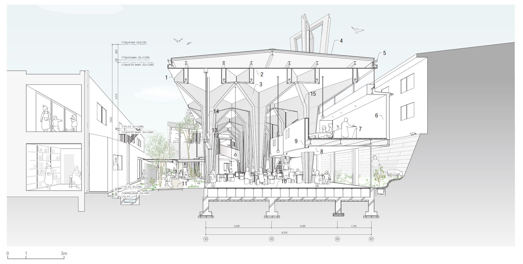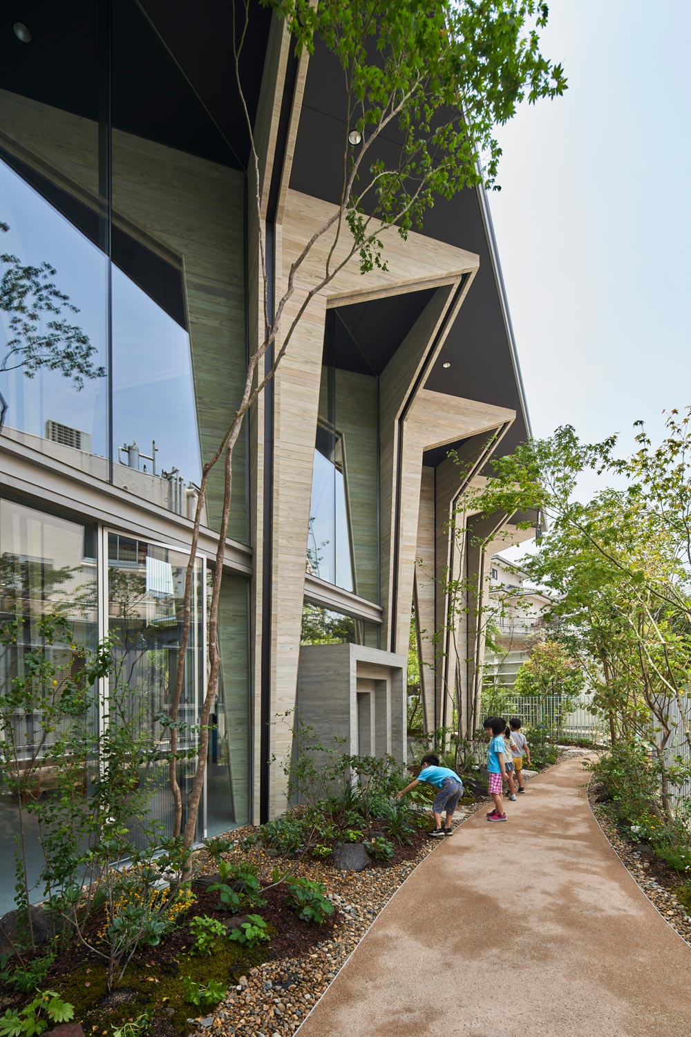 Within the village-esque nursery that has been built over the years, stories have continued to be woven, and will create a more dynamic and interactive relationship with the neighborhood and its surroundings. This project was initiated after an increase in the number of toddlers at the nursery and the need to replace the aging equipment in the old dining hall. Not only did it require me to design a dining hall, but also challenged me to recapture the essential features of an eating space. Therefore, instead of designing an ordinary cafeteria where people gather simply to eat, I aimed to create “an interactive environment” where parents and neighbors get together for lunch, birthday parties and other events. The building consists of three spaces: a dining hall for 40 toddlers, parents and staff; two classrooms for 4 and 5years old; and a lounge for the staff to relax after work.