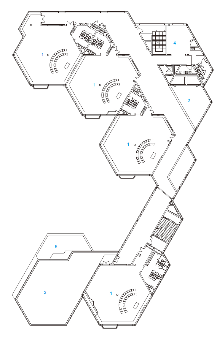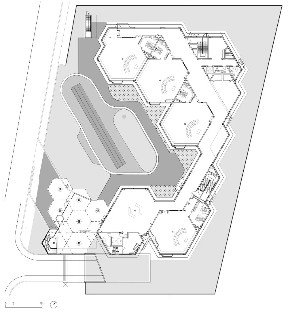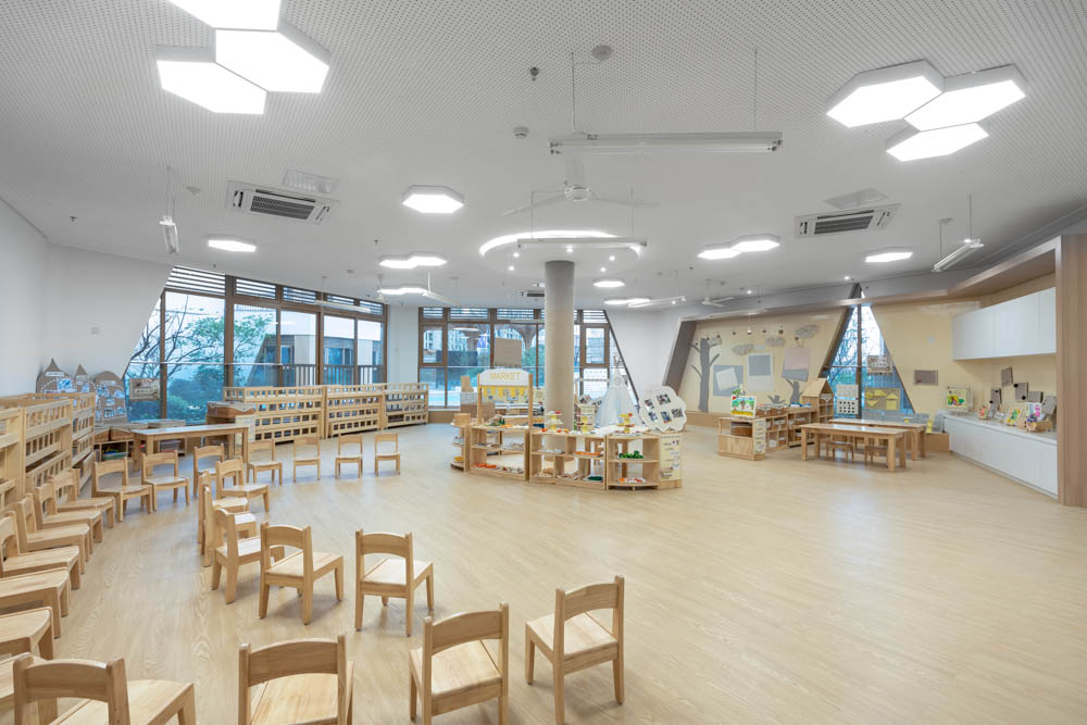 육각형 공간은 직각이 아닌 많은 공간을 만들어, 어린이들의 탐구와 놀이의 본질에 부합한다. 단조로운 복도 패턴을 확실히 깨뜨리기 위해 지그재그의 “활성 공간”이 각 공간 단위를 연결하는 골격으로 표시됐다. 반면에 비좁은 운동장에서 아이들의 야외 활동을 보장하기 위해 건축가는 공간을 3차원으로 확장한다.