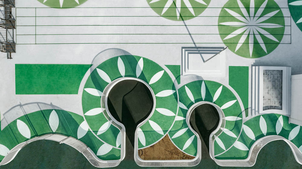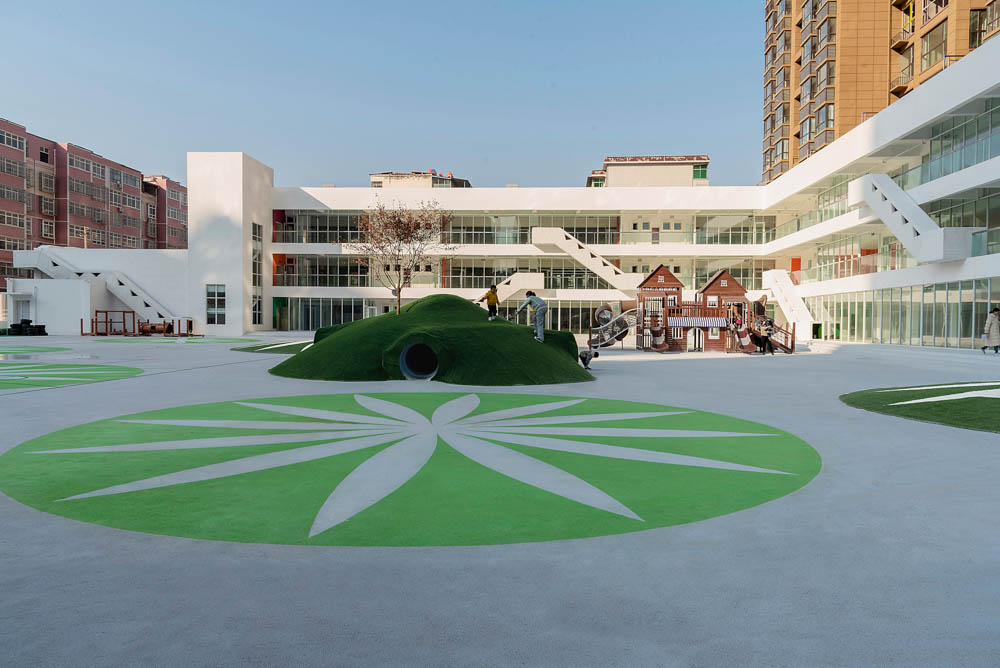 L자형 복도에 있는 장식과 기둥, 기존의 프레임은 제거됐고, 간결하고 개방되어 보이도록 기존 건물의 형태가 다듬어졌다. 다섯 세트의 슬라이드가 파사드에 기대어 각 층의 야외 공간이 연결되고 아이들의 활동 경로에 높낮이가 생긴다. 외부에서 내부로 도드라진 채도가 높은 색상의 벽을 일부에 적용하여 깊숙한 여백의 입체감을 지속적으로 확립하면서도 기능적 공간의 변형을 이끌어낸다. 궁극적으로 내부와 외부가 서로 이어지며 통합된 건물은 공간 사이의 경계가 흐려지고 야외 놀이터로 확장된다.