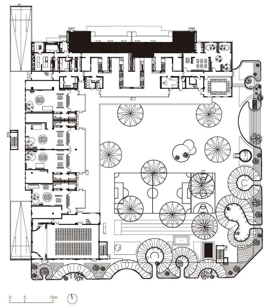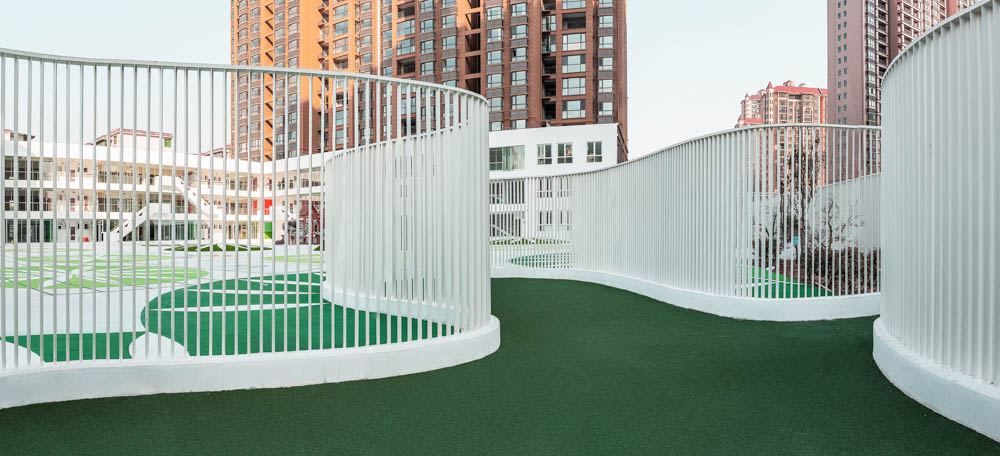 The curved fence walls also influenced the developing of the interior activity spaces. In this way, layer by layer, from the outer city, the middle zone, the tortuous boundary, various types of internal venues, the outdoor platforms between the building and the playground, the outer porch, the front hall of each outdoor activity venue to the various indoor activities and functional spaces, a multi-dimensional experience is set for the children to perceive when crossing through the spaces and grow up in exchanges. Correspondingly, this child growth and development center is like a new form of park, organically embedded into the community, injecting new vitality into the community.