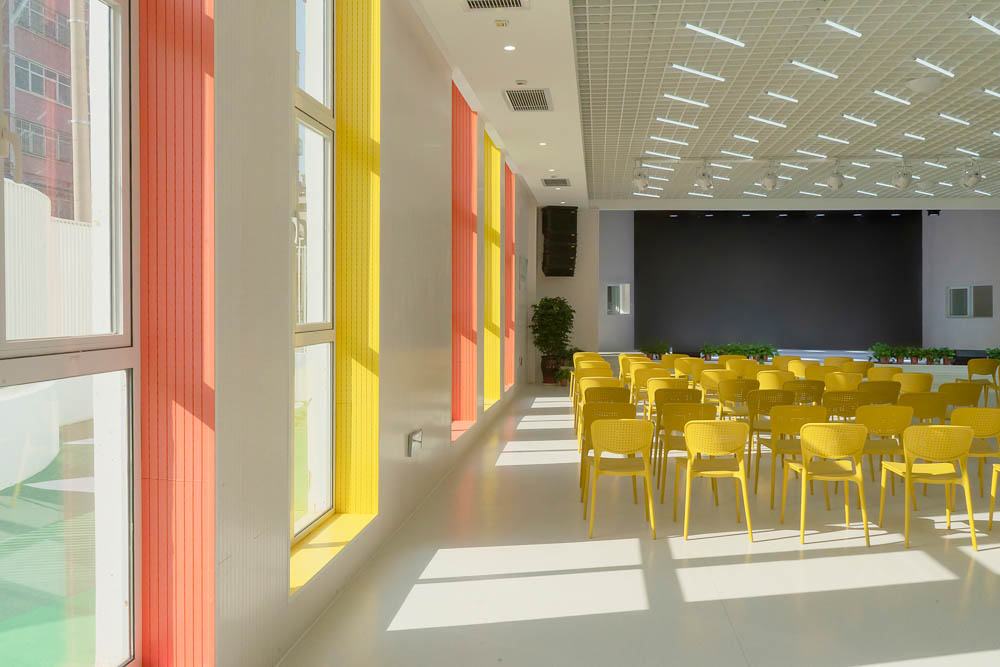 Removing the decorations and all the extra vertical lines on the L-shaped corridor, getting rid of the original shape, we cleaned the external facade of the original building as much as possible to make the building concise and stretching. At the same time, with five sets of slides leaning out of the facade, the outdoor space of each floor are connected, and children’s activity paths became undulating and has a happy flow. Pitching in from the outside to the inside, walls with high saturation color were used locally, which not only leapingly while continuously established the stereoscopic sense of the deep white space, but also guided the transformation order of the functional space. The feeling of purity was intended by us to be spread to the outdoor playground, eliminating the boundary between the internal building and the external space, which two parts ultimately extended and integrated with each other.
