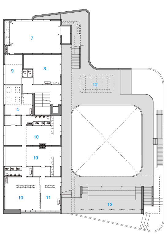 이 건물은 동향으로 배치되어, 산의 웅장하고 멋진 전망을 내다볼 수 있다. 내부와 외부 공간을 함께 엮은 상호 연결된 순환로로 인해 건물 자체는 미끄럼틀, 인공 클라이밍벽 및 다양한 크기의 계단이 통합된 거대한 놀이기구와 같다. 그리고 수많은 구멍이 뚫린 물결 모양의 콘크리트 벽이 건물 주변을 둘러싸고 있어 보안과 프라이버시를 강화한다. 이 견고한 철근콘크리트 벽 외에도 내부 및 가시성이 높은 외부 영역의 목재 웨인스코팅, 눈이 날리는 지역의 유지 관리가 쉬운 갈바륨 지붕 및 외장 공사 재료로 구성됐다.
