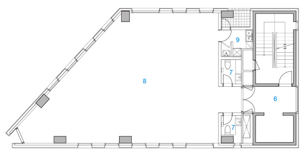 As a plan to have a similar size to that of the nearby hospital and hotel, the floor height was increased and the ground area was divided as much as possible into amenity spaces, expanding it to 40m with an eight-story scale including the rooftop floor. The legal standards, the shape of the site, and the surrounding buildings all acted as guides of the plan and led to a 10m wide, 13m~22m long and 40m tall cube form with a high slenderness ratio, and the building gained a form that is revealed unintentionally.